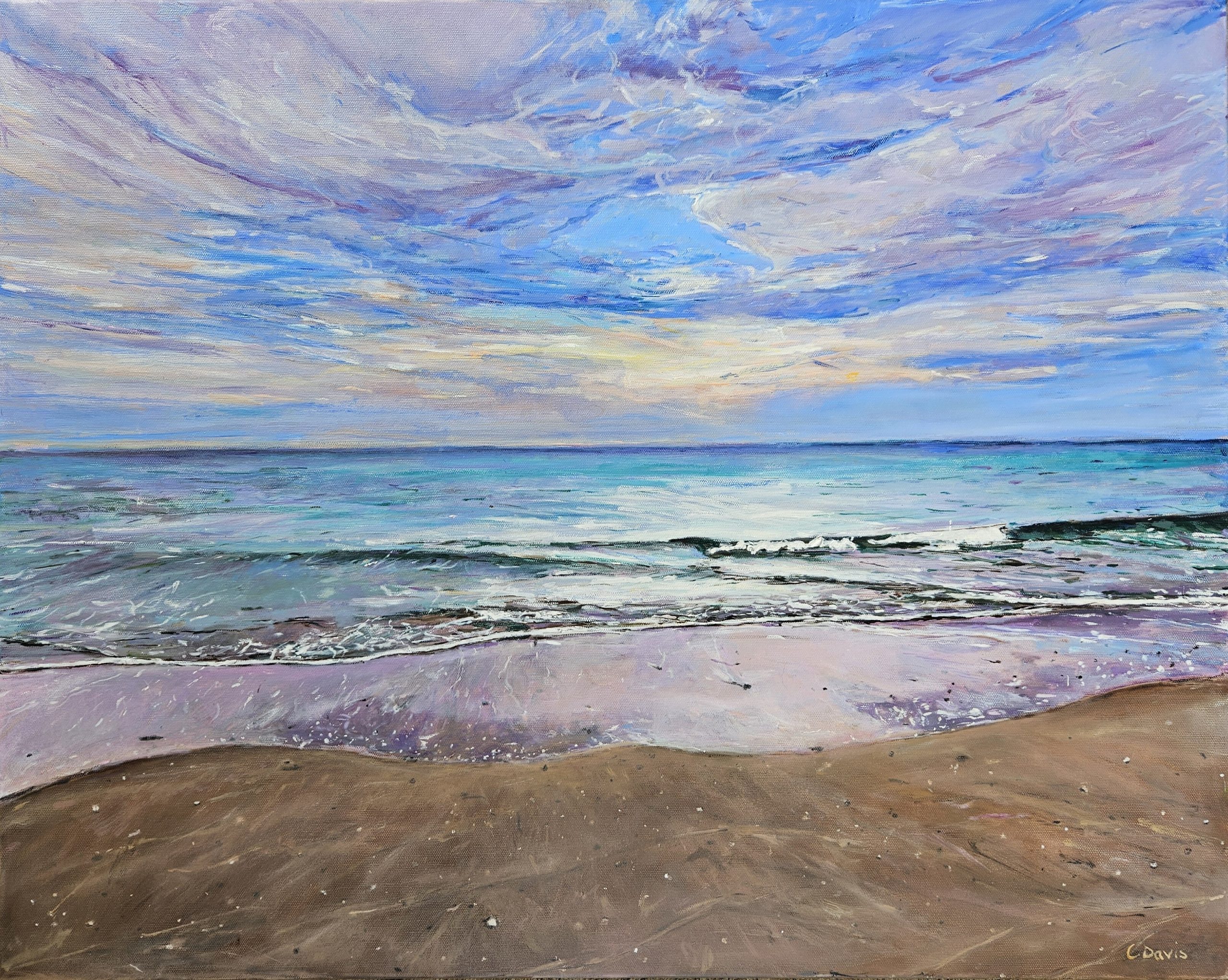 `Pastel Coastal Landscape` is a mesmerizing artwork that transports the viewer to a peaceful coastal landscape. The artist has captured the essence of a calm morning by the sea, where the gentle waves whisper to the shore under a vast and cloudy sky. The use of soft, pastel colors creates a dreamlike atmosphere, inviting the viewer to immerse themselves in the tranquility of the scene. The sky dominates the upper portion of the canvas, with its gradient of blues and purples blending seamlessly into each other. Wispy clouds drift lazily across the sky, catching the first light of dawn and casting a warm, golden glow over the entire scene. The sea is a serene expanse of turquoise and teal, its surface reflecting the colors of the sky above. The water ripples gently, creating a sense of movement and life in the otherwise still landscape. The shoreline is a narrow band of sand that separates the sea from the sky, painted with warm browns and ochres that suggest the warmth of the early morning sun. The sand is textured with tiny details that hint at the presence of shells and grains of sand, adding a touch of realism to the otherwise ethereal scene. The composition is carefully balanced, with the horizon line serving as a dividing point between the spacious sky above and the grounded sea below. Overall, `Early morning on the beach` is a tranquil and serene artwork that speaks to the beauty and peacefulness of nature. The artist`s skilled use of visual elements such as color, light, and composition creates a sense of harmony and tranquility that invites the viewer to escape into this idyllic coastal landscape and find a moment of peace and serenity.