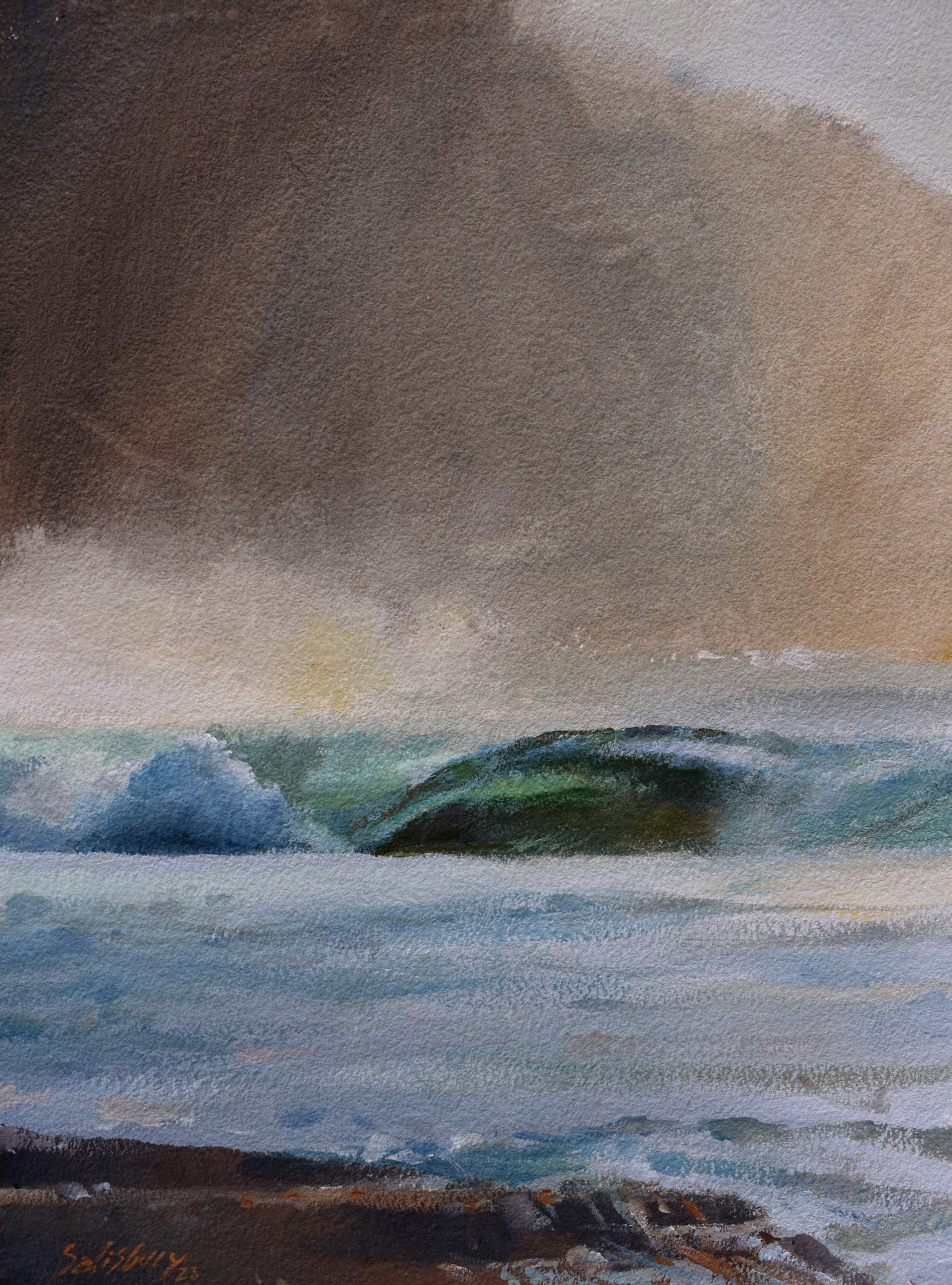 Early morning slab by Trevor Salisbury – the adrenaline is maxing as 10 foot slabs are on the menu before breakfast. Mixed Media on paper