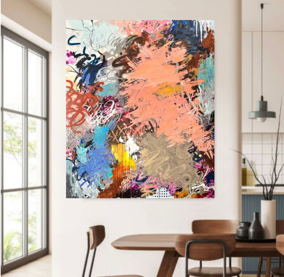 This artwork is purely paint on canvas, it is intuitive, free flowing, and can be interpreted however the viewer sees it and responds to it.