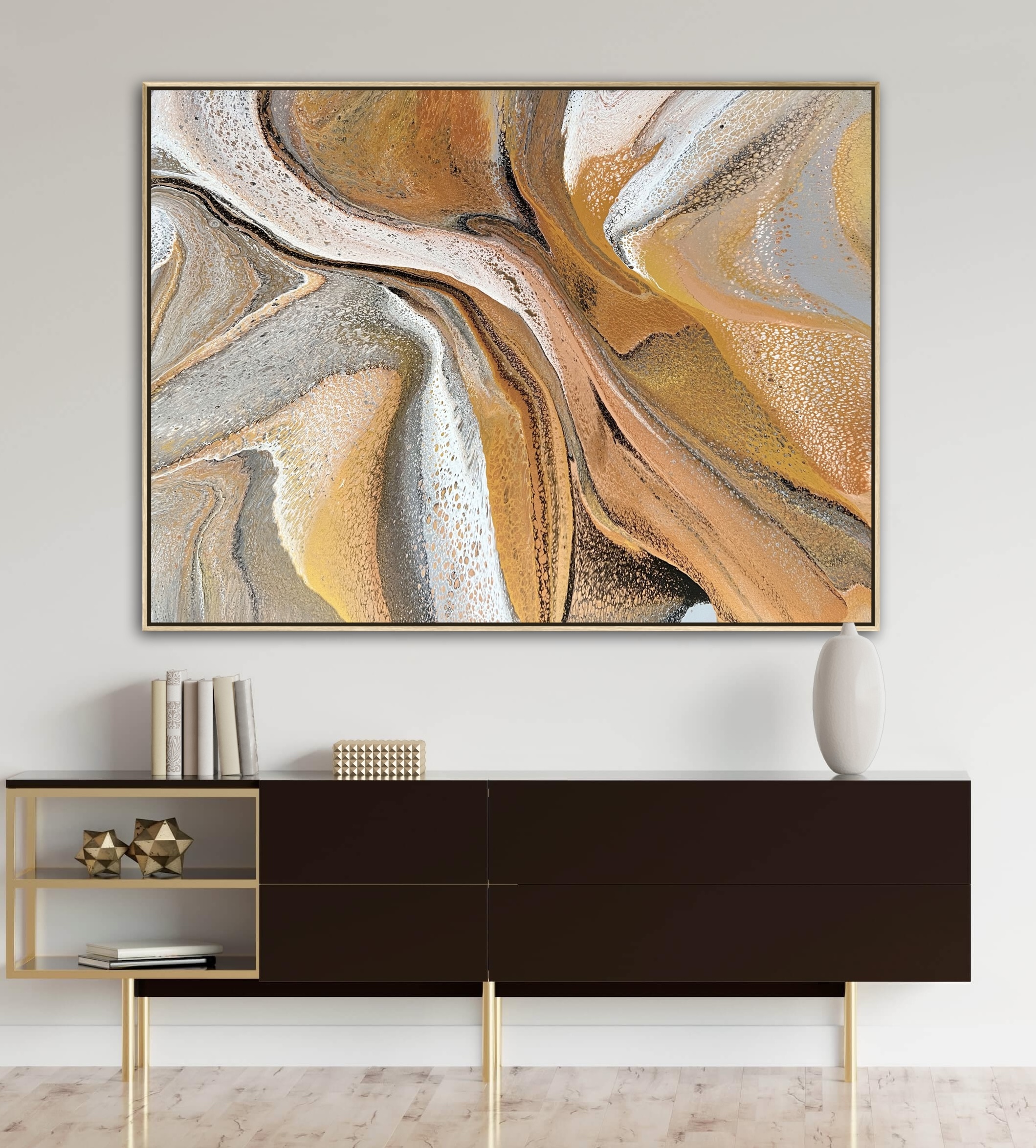 Earths Fusion was created using various techniques combined to allow increased flow, interaction and separation of colours to create interesting patterns where pops of colour can be seen emerging from underneath. This added dimension adds lace and cells to the artwork creating an interesting and one of a kind painting that can never be replicated. A gorgeous variety acrylic pigments were used including metallic yellow and warm gold, cream, brown, bronze, silver, grey, black, rose gold and white.