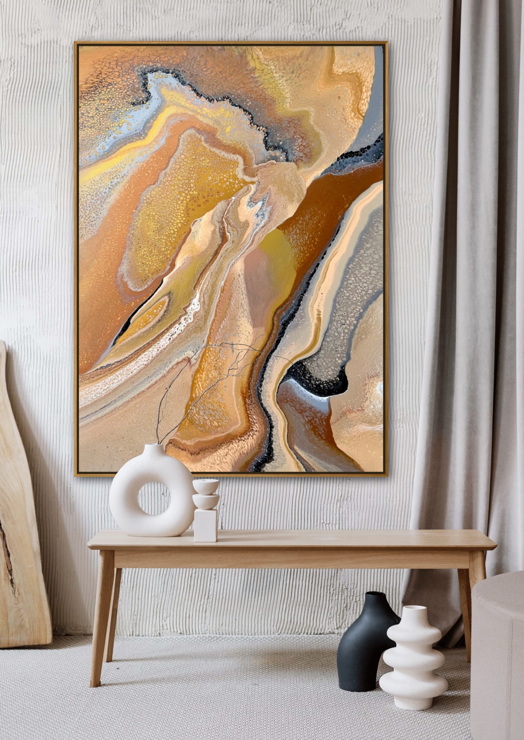 Earths many forms was created using various techniques combined to allow increased flow, interaction and separation of colours to create interesting patterns where pops of colour can be seen emerging from underneath. This added dimension adds lace and cells to the artwork creating an interesting and one of a kind painting that can never be replicated. A gorgeous variety acrylic pigments were used including metallic yellow and warm gold, cream, brown, bronze, copper, Â silver, grey, black, rose gold and white.