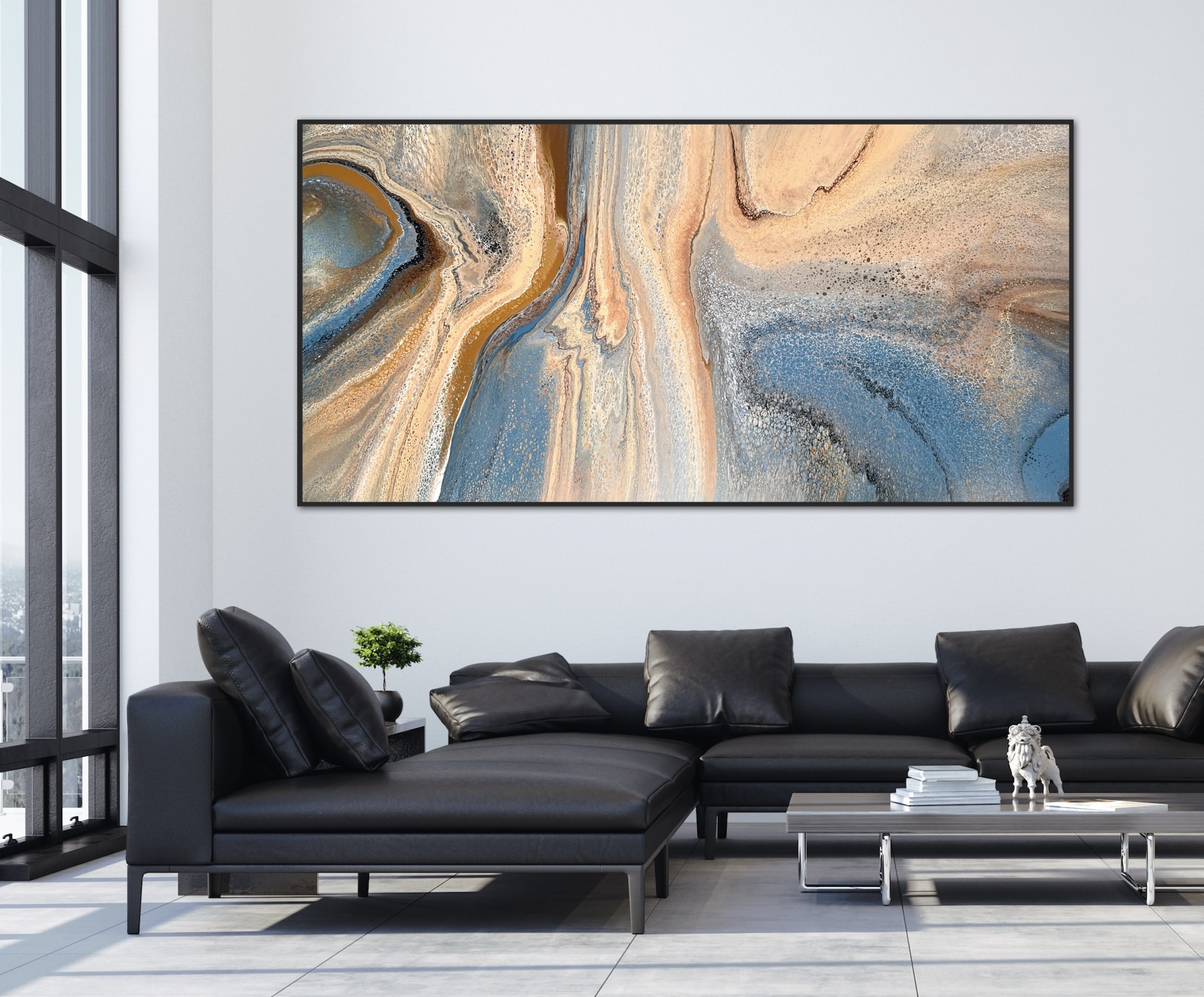 Earths Sanctuary was created using various techniques combined to allow increased flow, interaction and separation of colours to create interesting patterns where pops of colour can be seen emerging from underneath. This added dimension adds lace and cells to the artwork creating an interesting and one of a kind painting that can never be replicated. A gorgeous variety acrylic pigments were used including metallic yellow & rose gold, bronze, silver, cream, warm brown, peach,blue, grey, black and white.