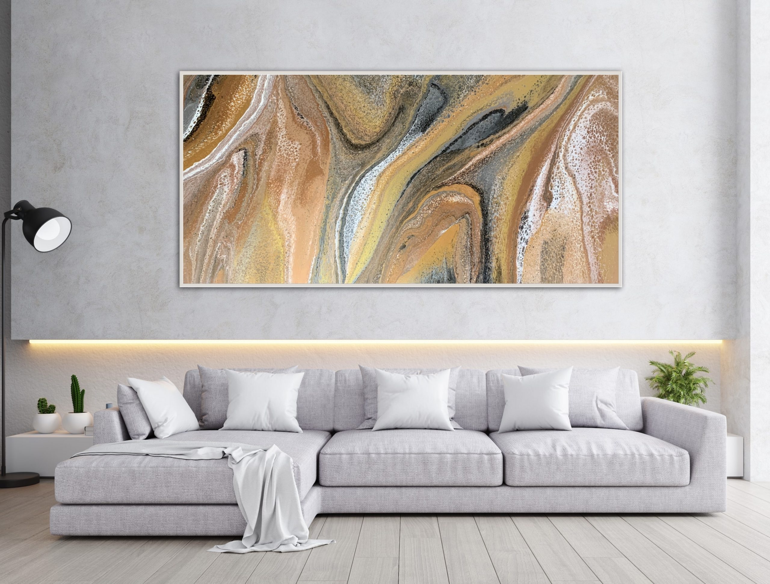 Earths Transitions was created using various techniques combined to allow increased flow, interaction and separation of colours to create interesting patterns where pops of colour can be seen emerging from underneath. This added dimension adds lace and cells to the artwork creating an interesting and one of a kind painting that can never be replicated. A gorgeous variety acrylic pigments were used including metallic yellow & rose gold, bronze, silver, cream, copper, grey, black and white.