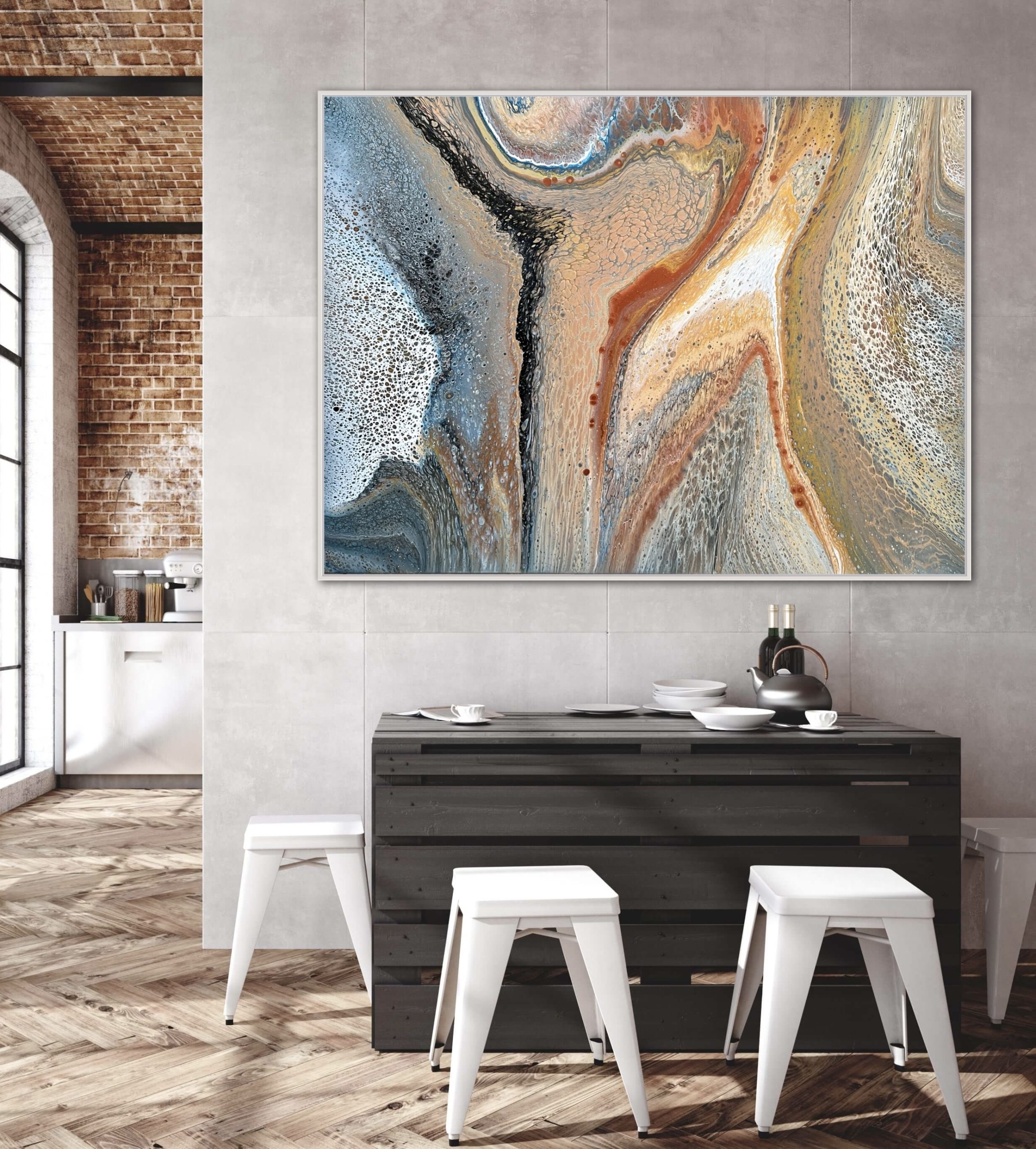 Earths warm light and shadow was created using various techniques combined to allow increased flow, interaction and separation of colours to create interesting patterns where pops of colour can be seen emerging from underneath. This added dimension adds lace and cells to the artwork creating an interesting and one of a kind painting that can never be replicated.