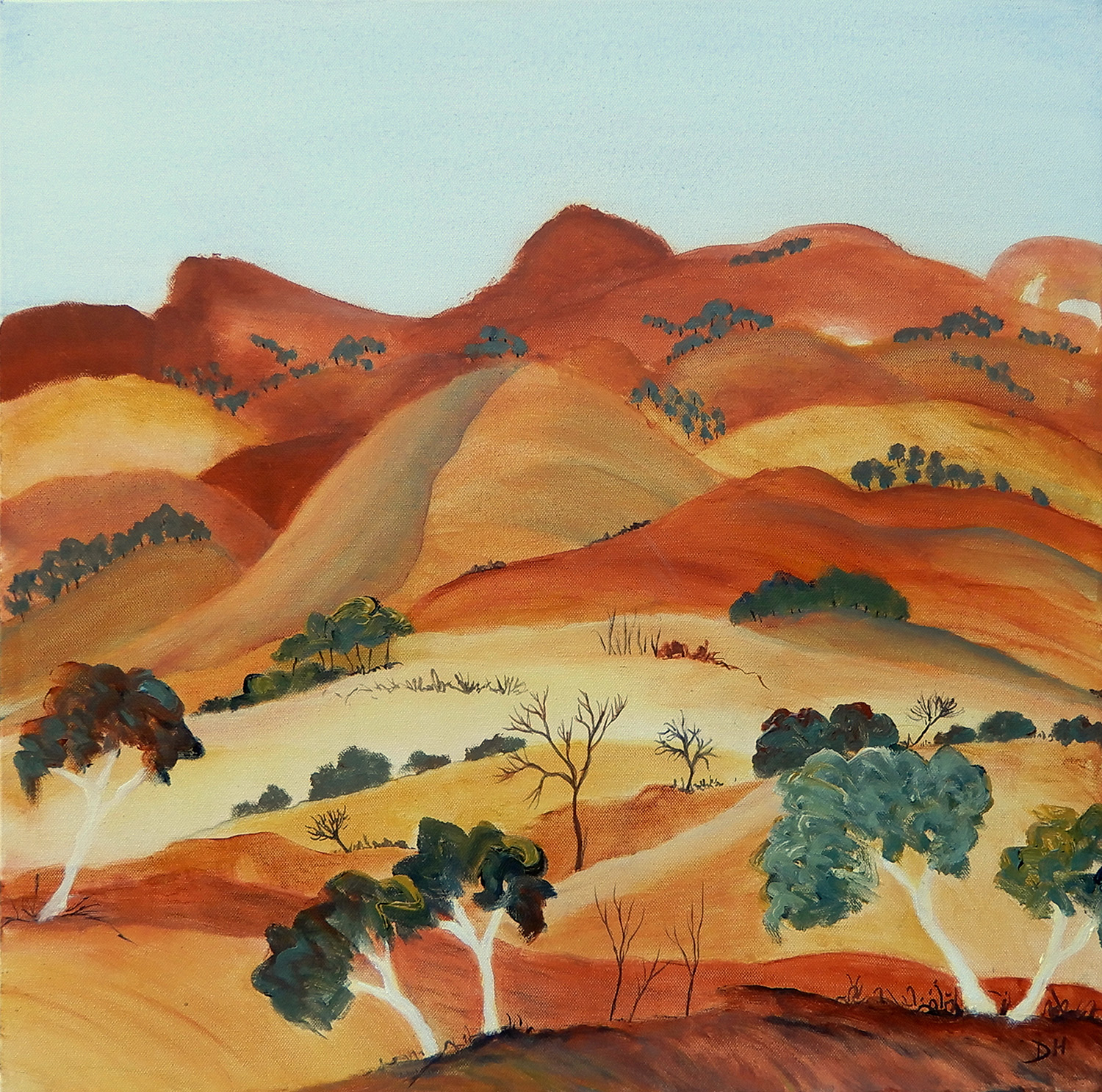The ranges east of Mparntwe (Alice Springs) aren’t the stars of the tourist trail, which mostly leads west of the city. They are just as extraordinary and their shapes and forms remind us of the cataclysms of the earth’s geological history. This artwork is part of a small body of semi-abstract works inspired by the landscapes around Mparntwe.