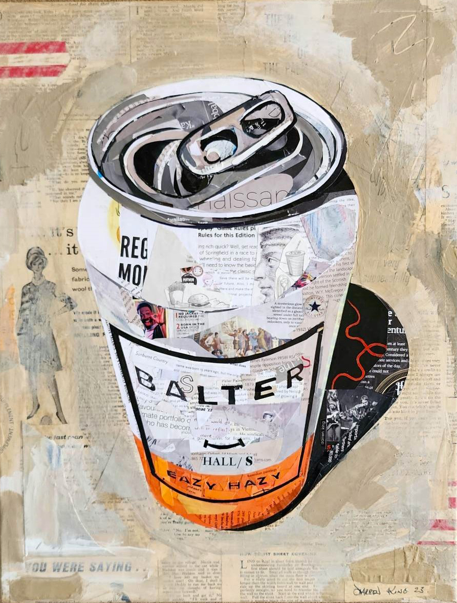 Hundreds of small pieces from different sources are combined to create this textural one of a kind original. The can and shadow are all paper collage, the background is acrylic paint over collage to create a contrast.