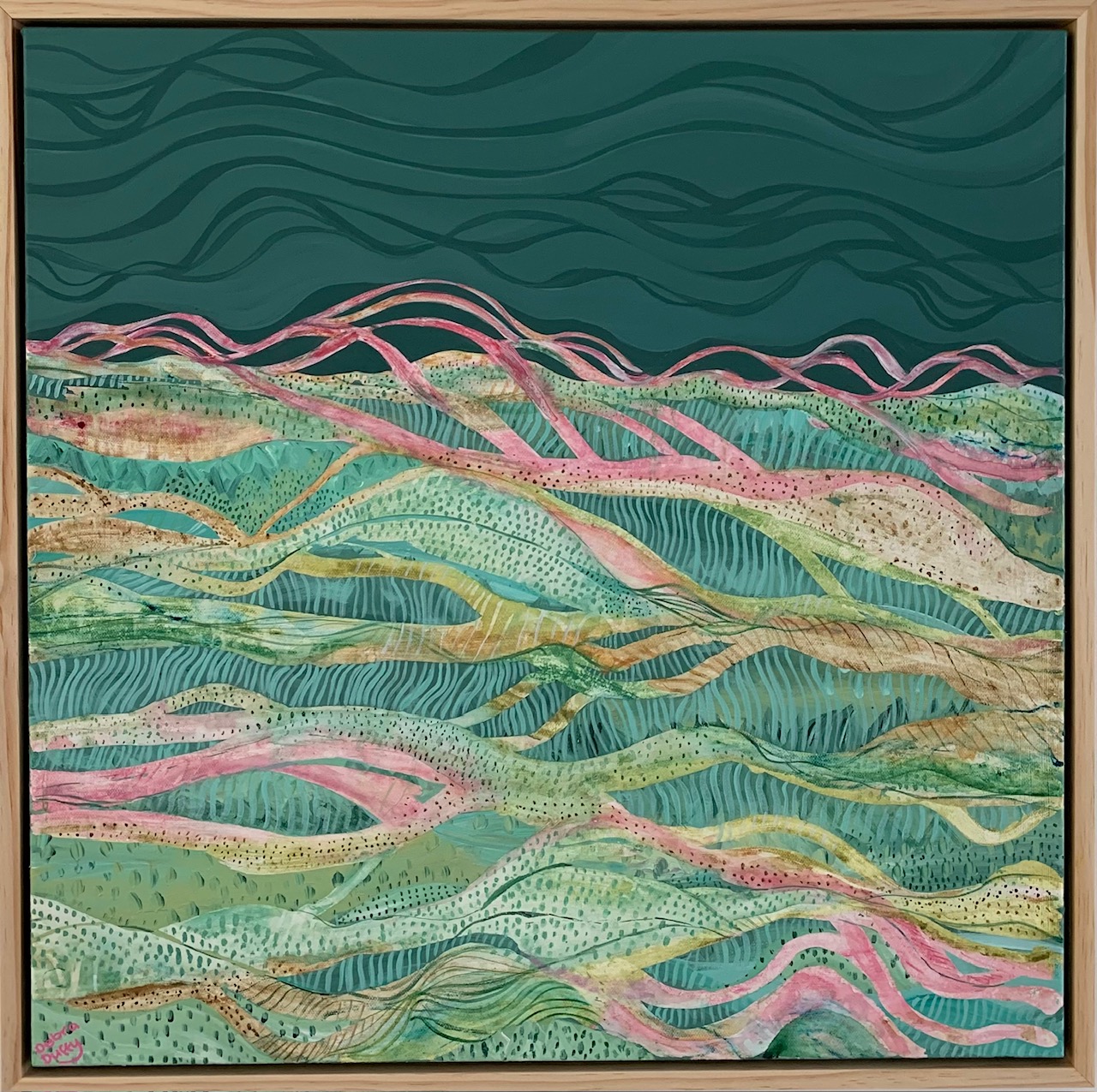This artwork comes with an external frame made of Chilean Pine wood which finishes this artwork beautifully and would compliment all interiors. I hope you enjoy exploring this artwork and thankyou for visiting.