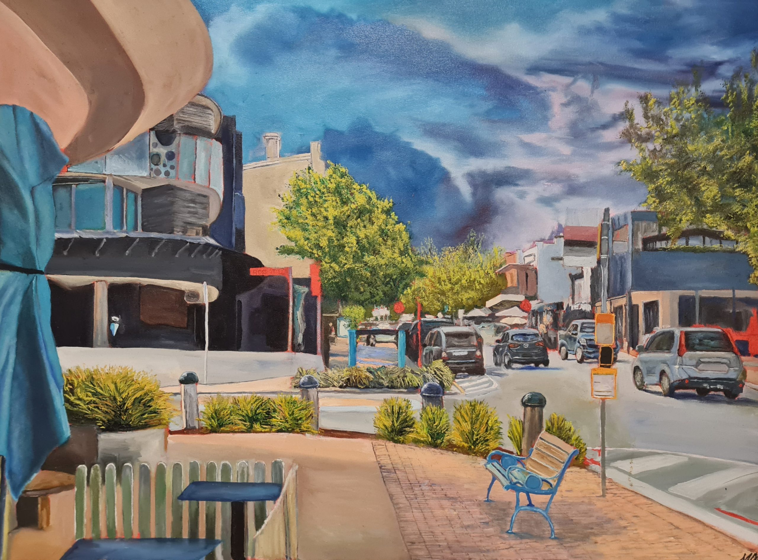Echoes of Mornington by Sam Brett – This painting captures a vibrant slice of life in the picturesque town of Mornington, Victoria. I was inspired by the interplay of light and shadow on the streets, the bustle of everyday life, and the sense of calm that permeates the air. The warm, natural tones reflect the tranquil yet lively character of Mornington, while the dynamic clouds above hint at the ever-changing moods of coastal weather.