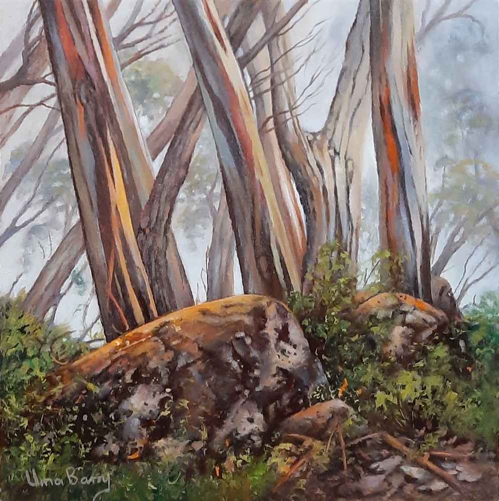 Echoes of Nature by Uma Barry – Hi everyone, this 20x20cm oil piece captures a quiet scene from one of my favourite spots at the Mt Baw Baw ski resort in Victoria, an area I hold close to my heart. This painting is my interpretation of what it looks like before winter when the forest reveals it’s colourful mood. I painted this piece entirely with a brush, letting the trees slowly take shape with their warm, peeling bark and soft shadows. To bring energy and texture into the scene, I gave the foreground a palette knife treatment, lifting the rocks and intricate undergrowth with the touch of contrast and dimension. The mist weaving the through the gums adds that familiar sense of calmness I often feel in this beautiful alpine landscape. Thank you so much for viewing and supporting my artwork, I really appreciate it. xxx