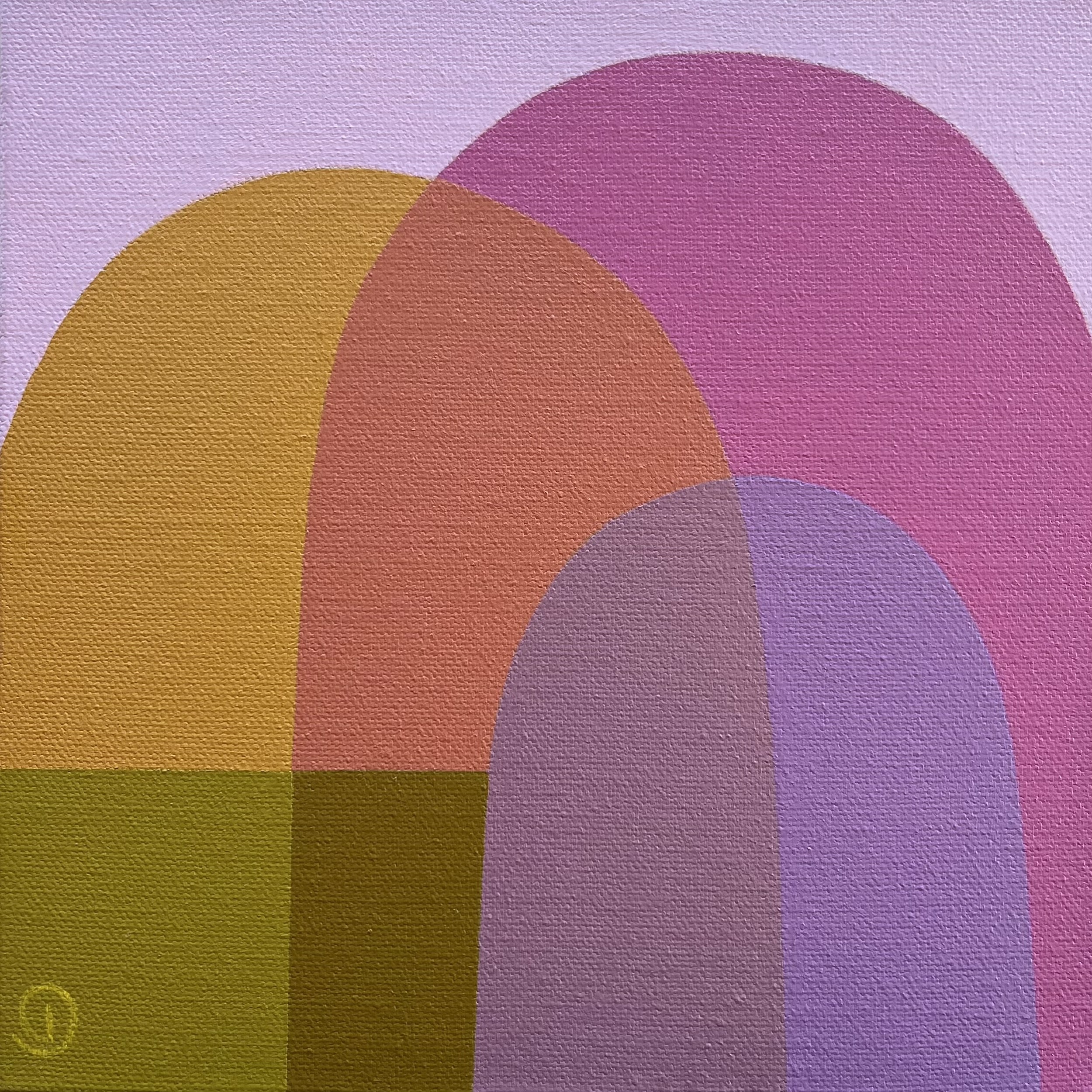 This painting is part of Charlotte’s Eclipse series and continues her exploration of ideas of transparency and solidity. Inspired by colour theory and stylised forms from nature, Charlotte embraces a distinctive, hard-edged abstract style, overlapping shapes and juxtaposing vibrant colours to achieve a sense of luminosity and equilibrium. Rainbow arcs are a recurring symbol in Charlotte’s artwork, chosen for their association with hope, peace and joy as well as their visual versatility in creating abstract compositions.