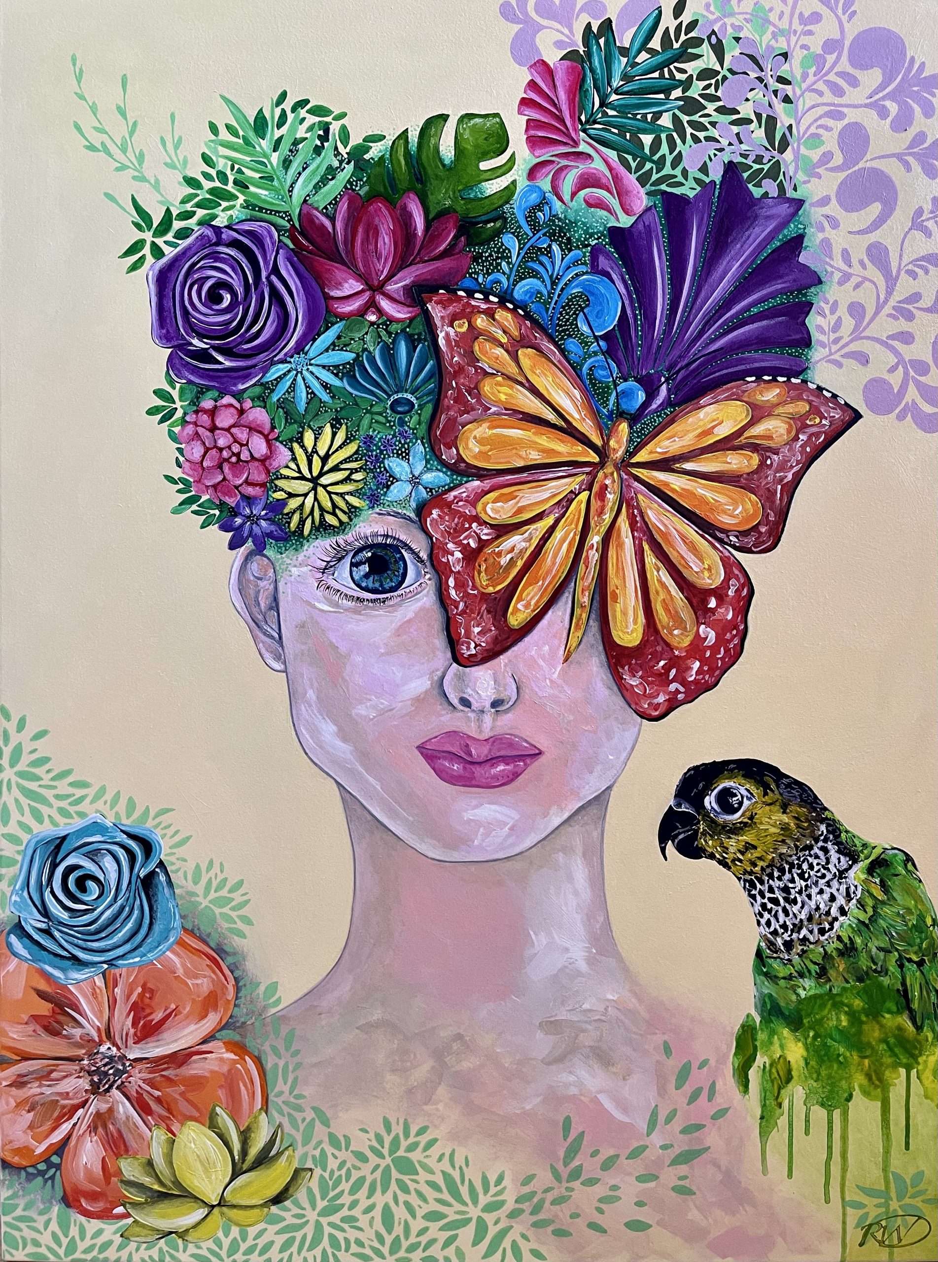 I feel as though ‘Eden’ has evolved from my subconscious in so many ways. I found a flow in creating this artwork that I have not experienced before. I was completely engrossed in the process and although it was time consuming, the end result was well worth it. In this work, I wanted to create a character of nature and beauty and incorporate my love of birds, pattern and vibrant colour. Eden’s eye draws the viewer in to explore the intricate detail in the rest of the work. I enjoyed incorporating portraiture into this piece and look forward to exploring it again in the near future.