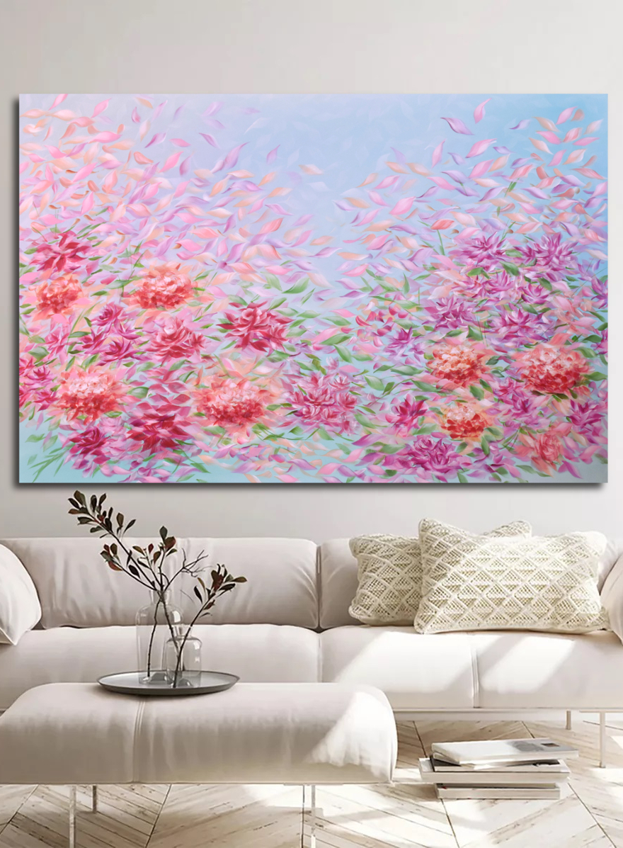 Original painting – a colour infused, eye-catching floral abstract acrylic painting stretched and ready to hang. This artwork has been finished with layers of professional grade varnish for extra protection and colour enhancement. It has a strong wire at the back.