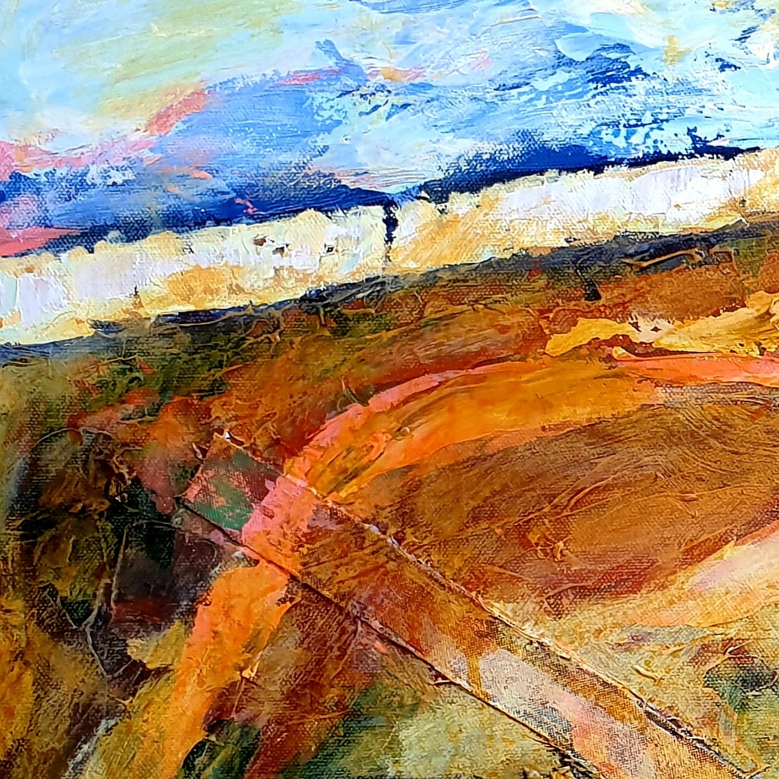 This landscape contains beautiful, multiple layers of texture and colour. Truly more beautiful in real life. It glows with rich ochres, sienna and greens. Broad confident strokes of the palette knife are evident. Texture has been created with areas of paint and strips of canvas. It is a stunning piece.