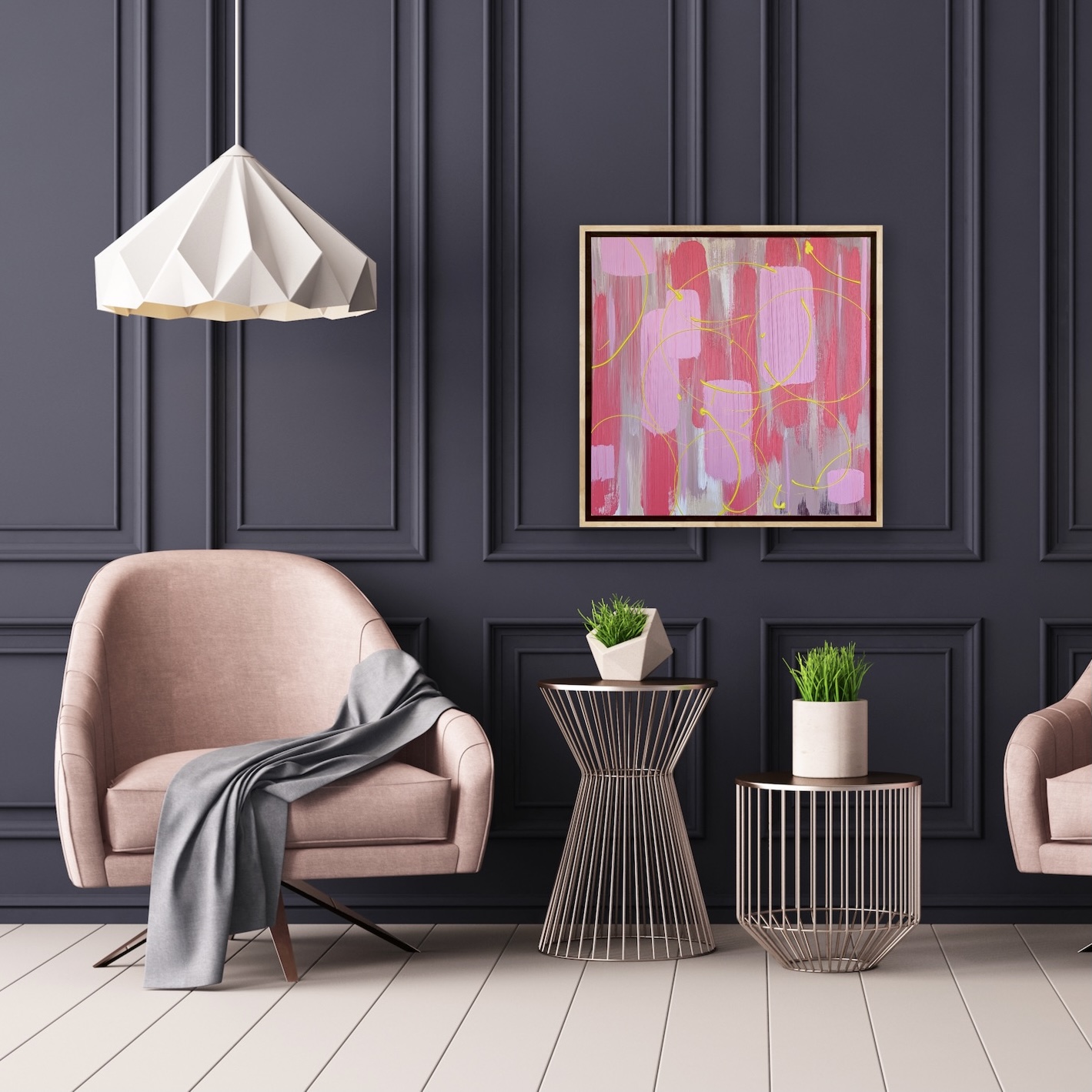 Modern, minimalist painting reflecting the bubbles in a glass of pink champagne.