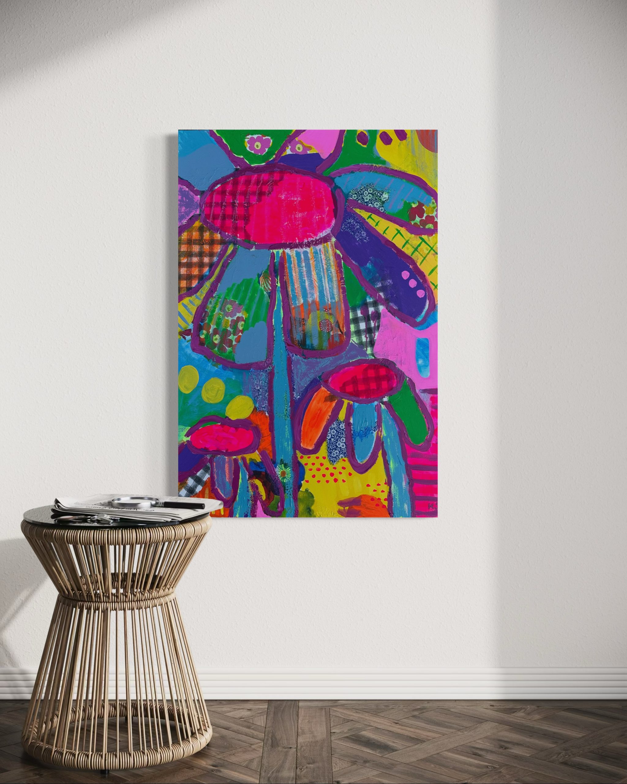 A bold explosion of colour and joy, Electric Bloom is a vivid celebration of life in full technicolour. This large abstract floral artwork features oversized, playful petals painted in fluorescent pinks, deep purples, electric blues, and vibrant citrus tones.