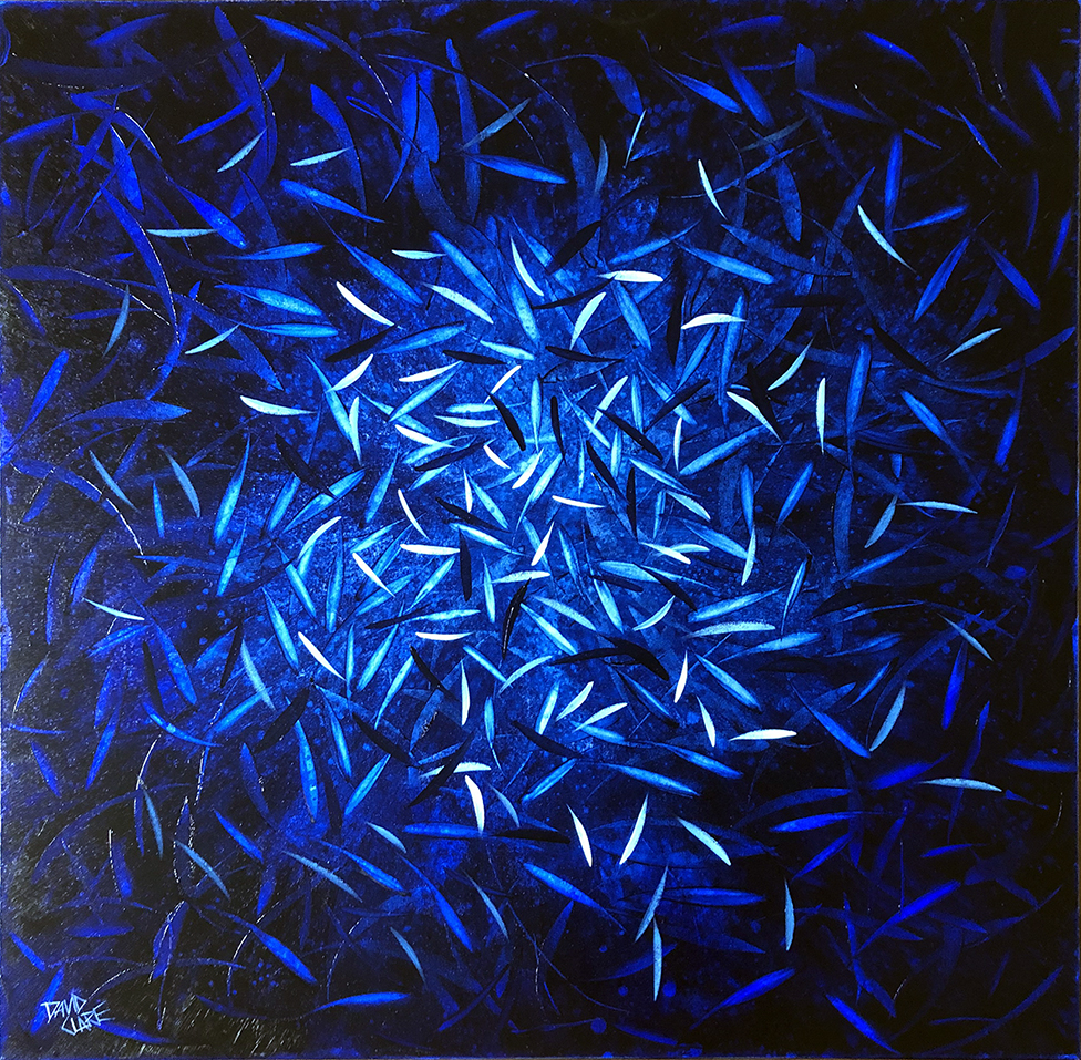 Original oil painting by David Clare, inspired by the deep blues of the ocean, and the flickering movement of schools of fish.
