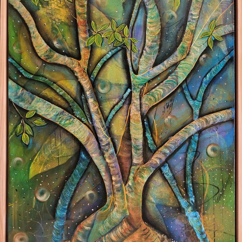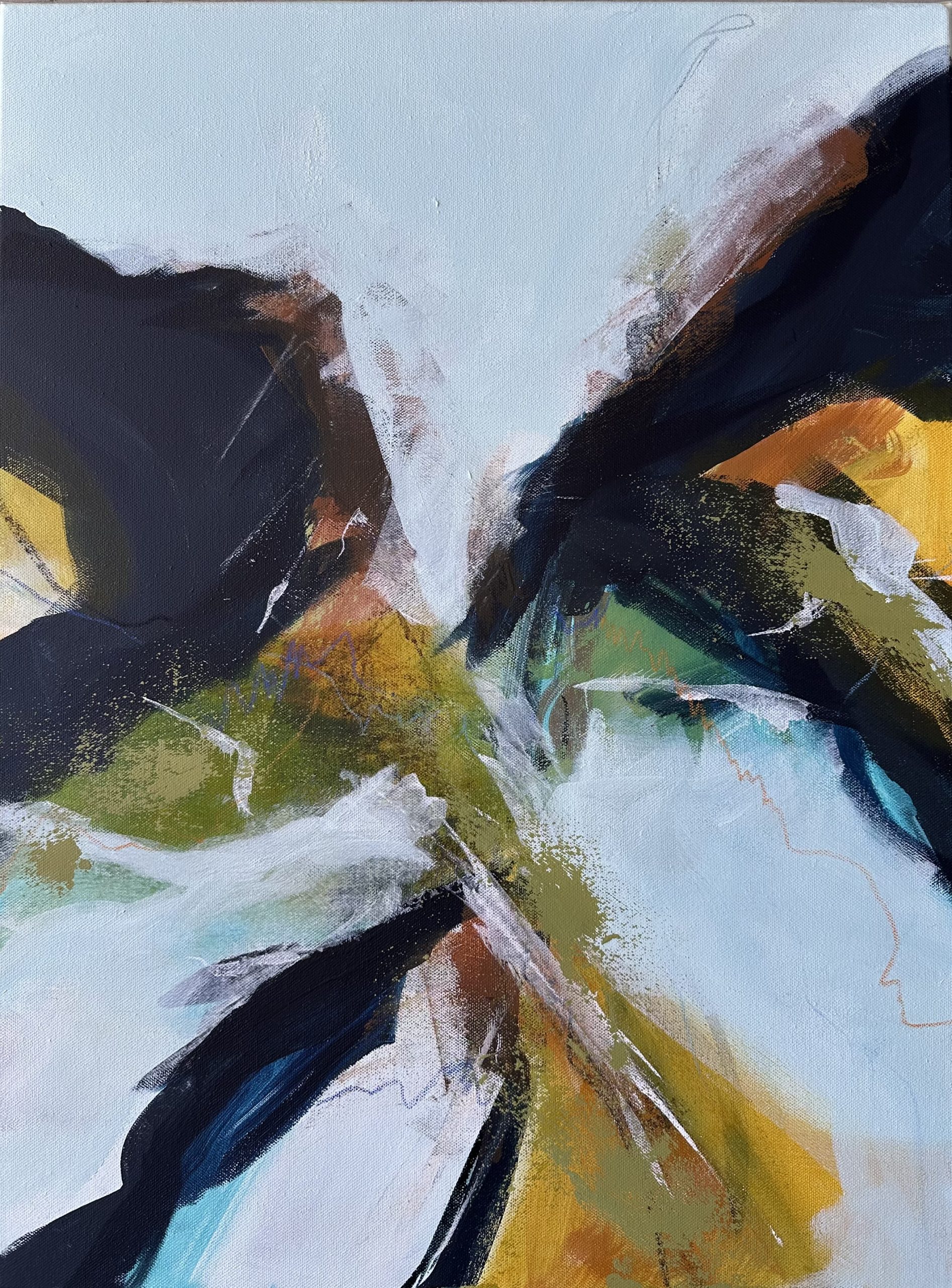 This series is inspired by my deep connection to the mountains, forests, and lakes—reflected in the cool blues and rugged, craggy textures throughout the work. The changing seasons and shifts in my environment often influence my palette, and in this case, the onset of winter combined with the anticipation of an upcoming trip to Austria helped shape the mood of the painting.