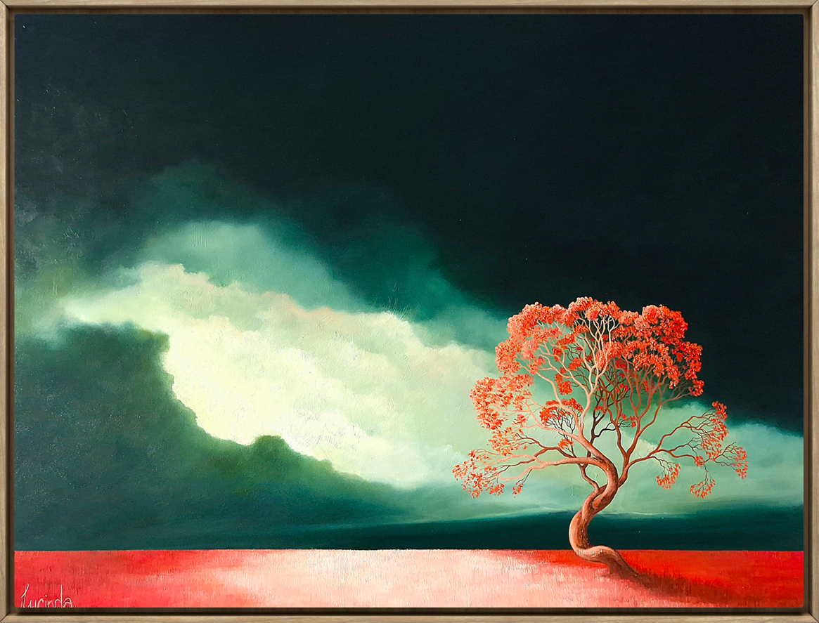 A vivid and surreal landscape unfolds in Ember Horizon, where a fiery red ground stretches endlessly beneath a tree ablaze in shades of red and orange. The solitary tree stands at the forefront, its leaves glowing like embers against the backdrop of a vast, open plain. Above, rich green clouds swirl across the sky, their unusual color casting a dreamlike atmosphere over the scene. A setting sun burns low on the horizon, its golden light diffused through the verdant clouds, lending warmth and intensity to the already charged palette. The painting evokes both stillness and energy, capturing a fleeting moment suspended between fire and dusk.