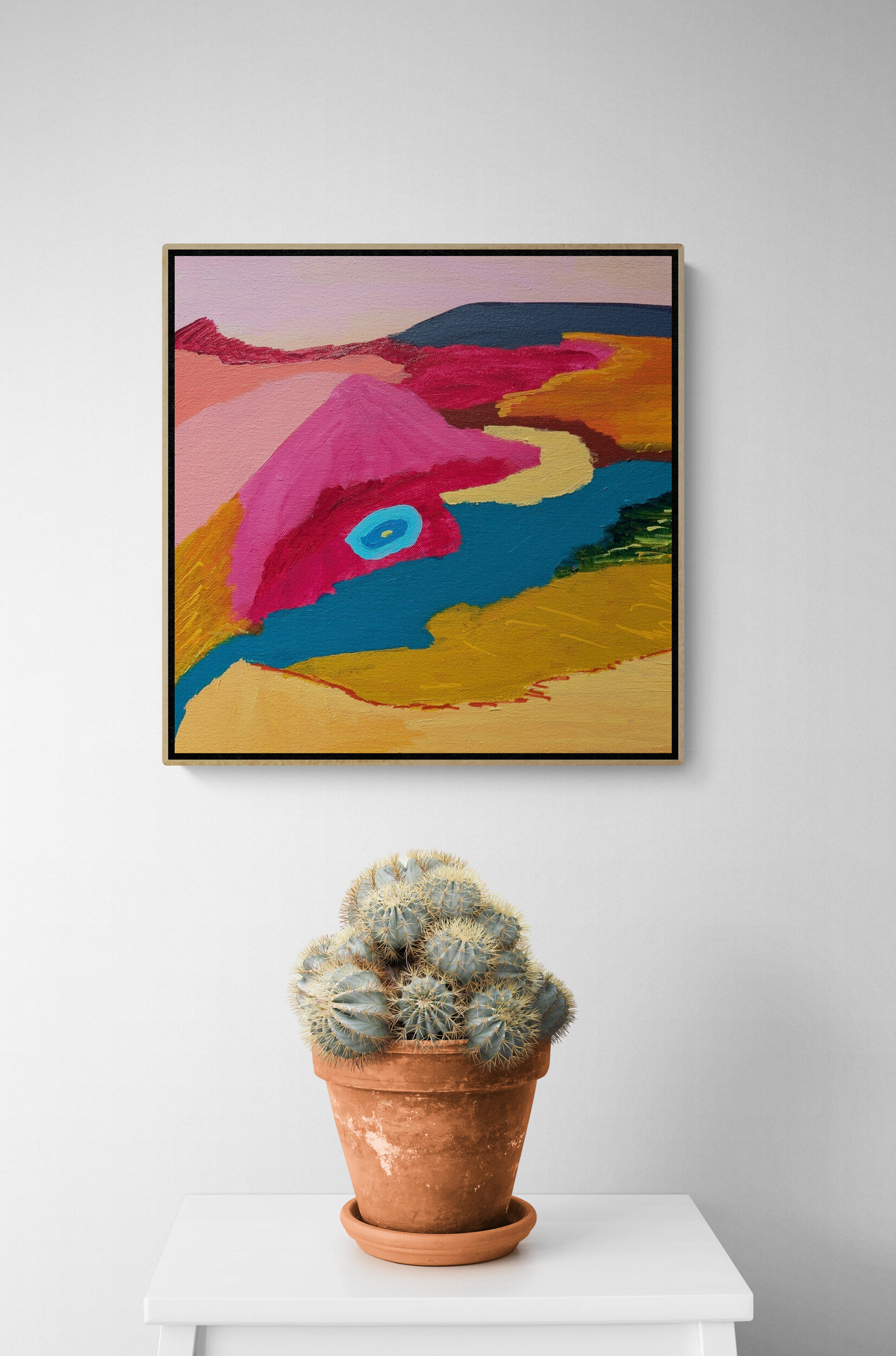Ember Valley is an abstract interpretation of the Australian landscape, where scorched earth meets the resilience of life. Painted in acrylic on stretched canvas, this work captures the fiery warmth and raw beauty of a valley shaped by time, sun, and spirit. The vivid pinks, ochres, and deep blues evoke the emotional landscape of bushfires, dry riverbeds, and the sacred silence that follows. Through layered colours and intuitive forms, I reflect on nature’s ability to burn, regenerate, and endure—drawing inspiration from the Australian outback and its quiet, powerful stories. This valley, though imagined, holds the embered essence of Country.