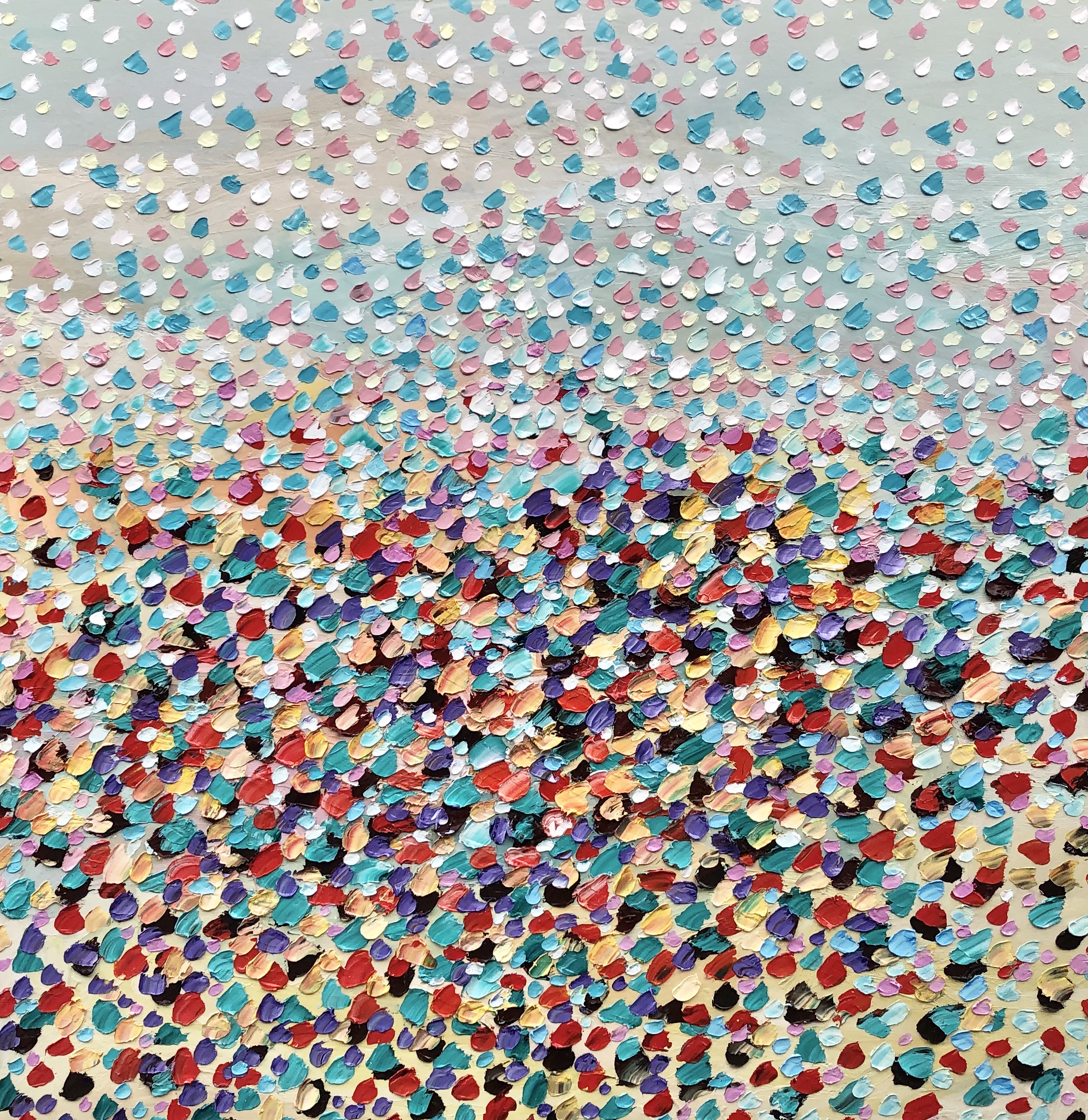 Embrace is a beautiful painting with so much depth by creating lots of layers of paint giving it a three dimensional feel. Petals falling from the sky falling onto the landscape, creating a beautiful bed of petals.This painting is painted with a pallet knife with thick oil paints on canvas. Hope this painting makes the viewer feel peaceful and tranquil. The painting is signed and dated 2020 at the back and comes with a certificate of Authenticity.
