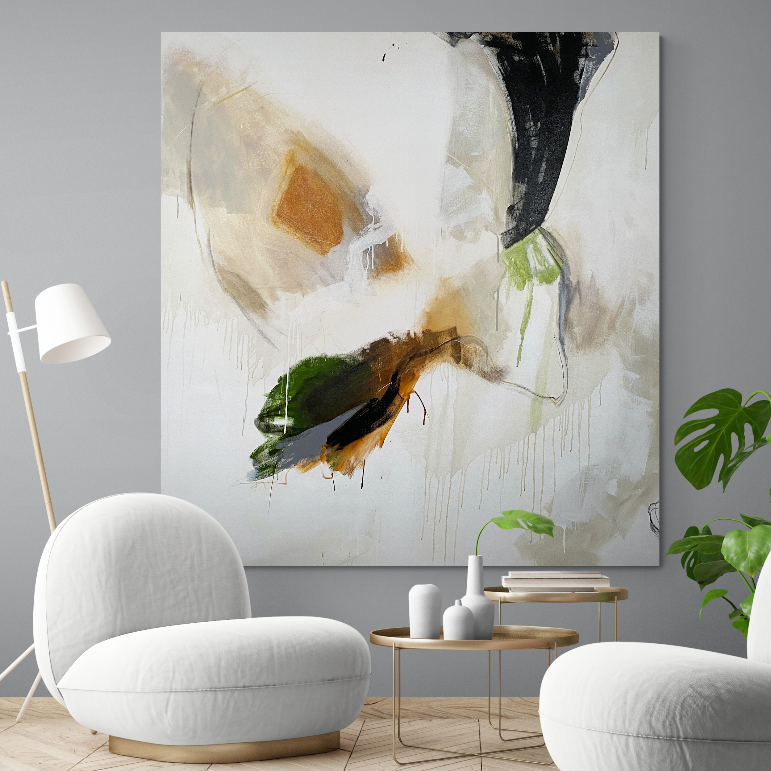 Embrace is a vibrant statement painting perfect for any large space. Its striking palette of light green mixed with rich ochre, beige, grey, and earthy tones ties together beautifully against areas of black and white which makes this piece come alive.