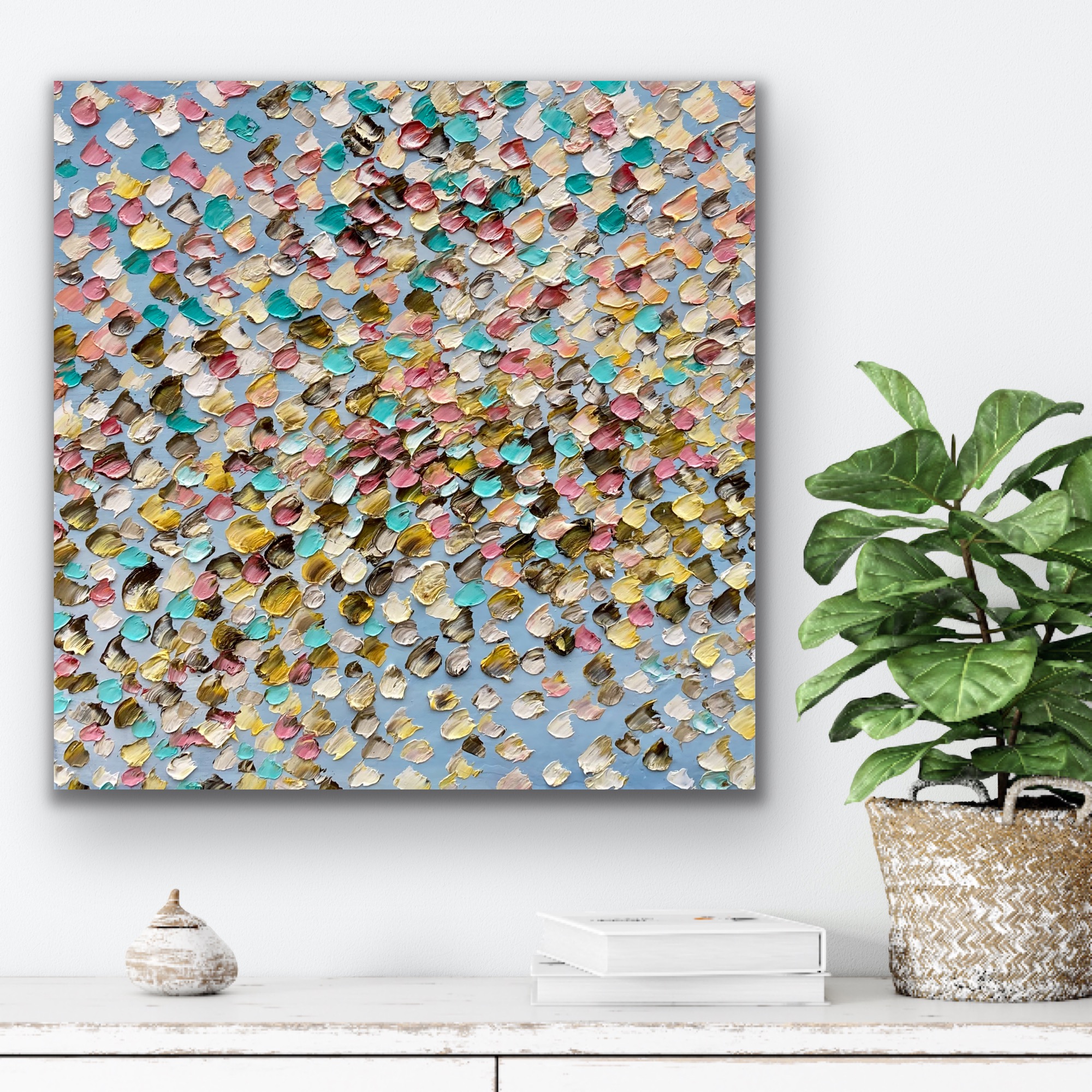 Embrace your Blessings by Theo Papathomas  a veil of petals covering the beautiful blue sky with thick oil paints to capture the textures of the petals. The painting is painted with a pallet knife to create a lot of depth in the painting .I used the beautiful emerald green colours to capture the leaves and playing with warm and cool colours . A very textured painting with so much depth by creating lots of layers of paint giving it a three dimensional feel .Weeping petals swept by the winds creating this musical Bouquet in the sky. Every petal represents a blessing from the Sky. Hope this painting makes the viewer feel peaceful and tranquil.The painting is signed and dated 2022 at the back and comes with a certificate of Authenticity.