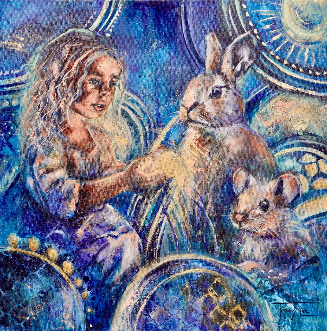 “Embrace Your Curiosity” by Tracy Lee Warusevitane – invites you to step into a world of wonder and exploration. A little girl, accompanied by a curious rabbit and a tiny mouse, gazes in awe at a glowing ball of light, symbolising the endless possibilities that curiosity unveils. This painting captures the magic of childlike wonder and the joy of discovery, encouraging us all to embrace our questions, follow our instincts, and let our curiosity lead us toward new adventures and insights.