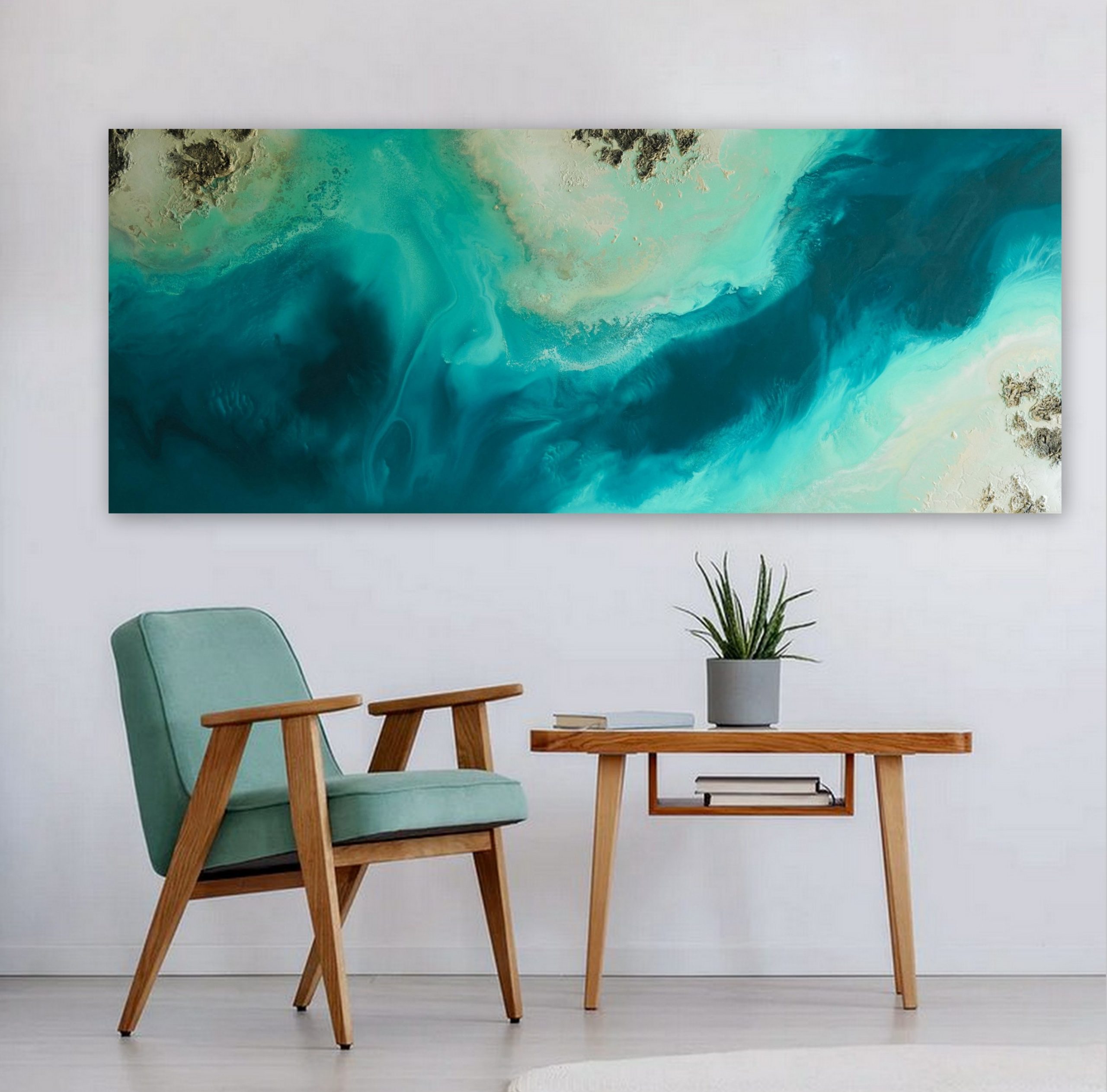 Turquoise Abstract Wall Art “Emerald Depths” by Petra Meikle de Vlas – is a highly textured, 3 dimensional, abstract aerial view of the ocean.