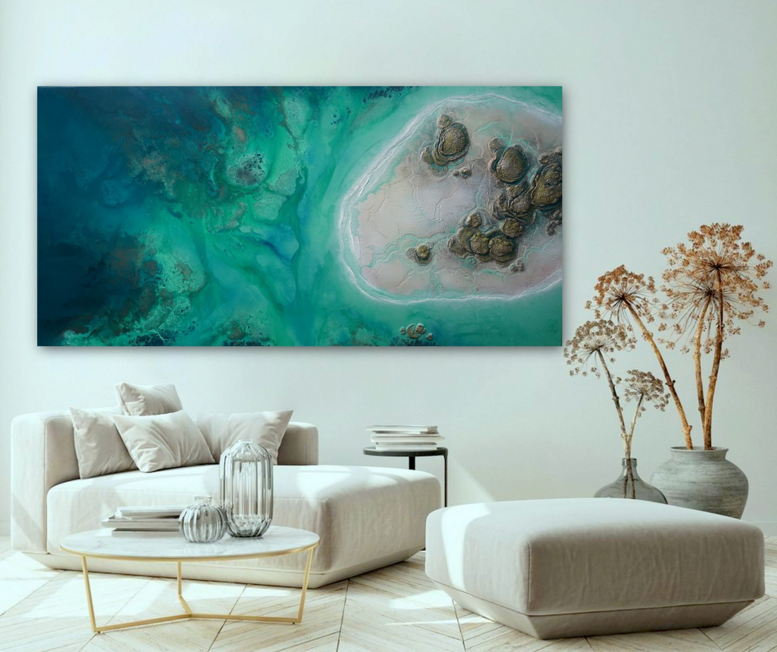 Green Abstract Wall Art “Emerald Embrace” by Petra Meikle de Vlas – is a highly textured, 3 dimensional, abstract aerial view of the ocean.