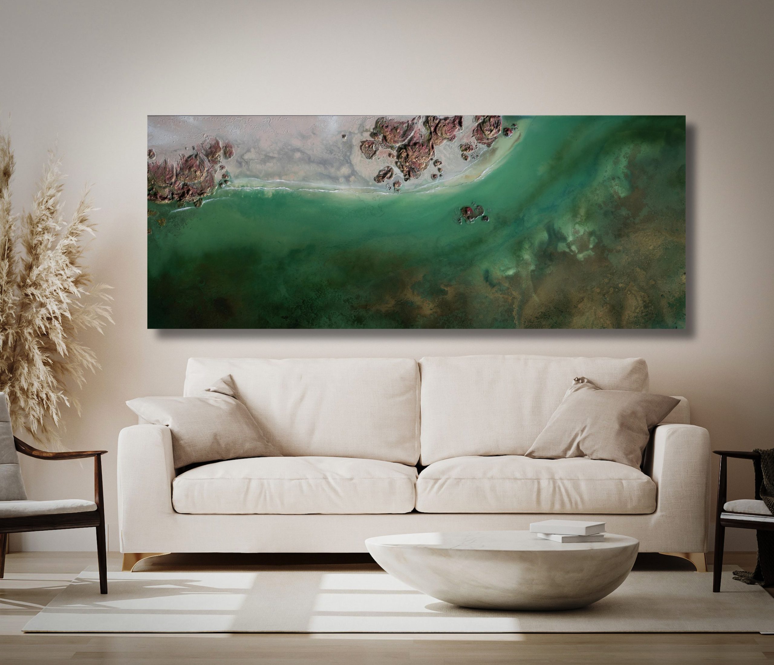 Immerse yourself in the serenity of the coastline with “Emerald Tides”, a striking 80 x 200 cm green ocean resin wall art. This aerial-inspired abstract seascape captures the rhythmic flow of waves along a rocky shoreline, layered in lush olive greens, emerald hues, and deep oceanic tones. The high-gloss resin finish enhances the depth and fluidity, making it feel like you’re gazing down from above a tranquil beach.