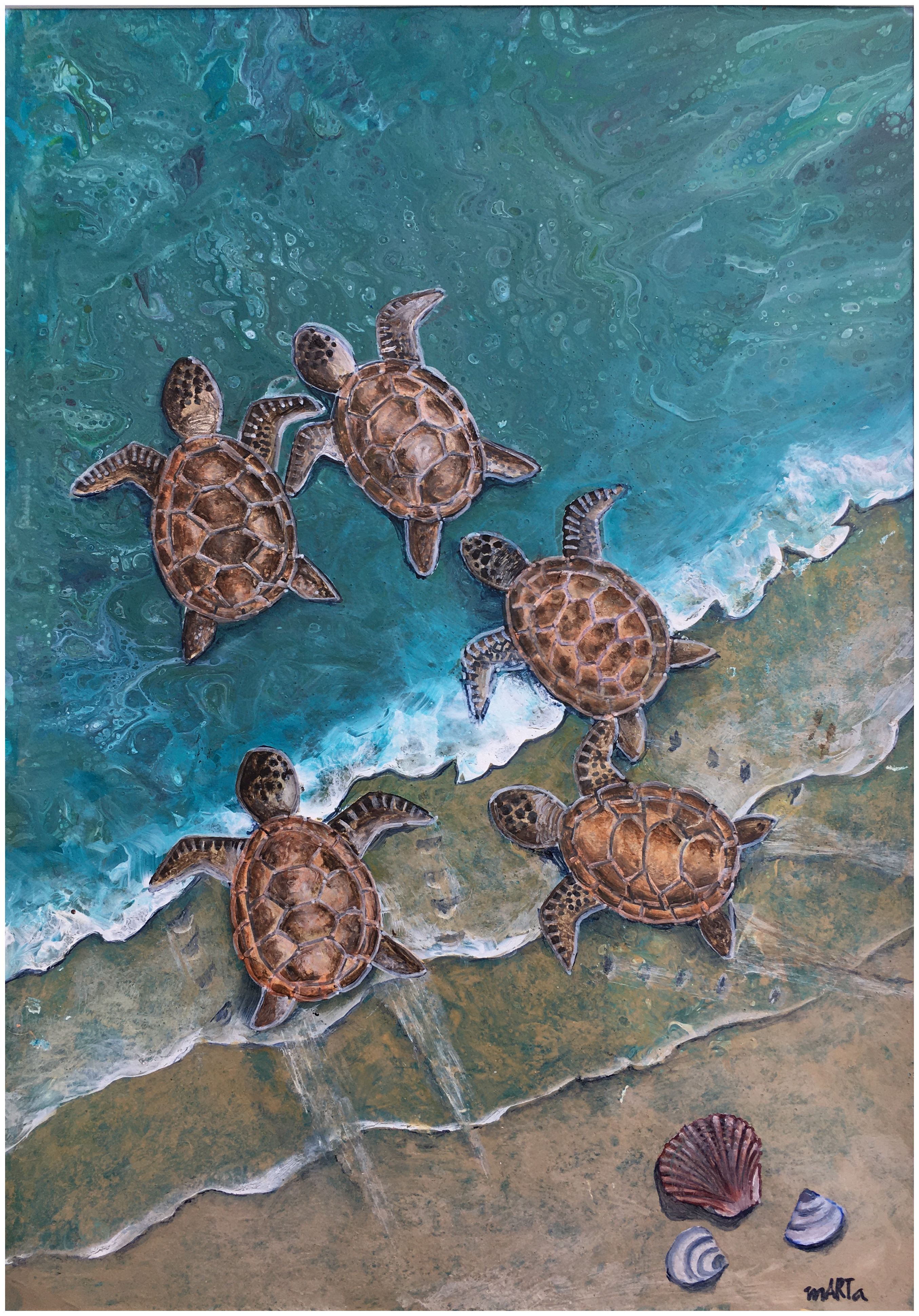 Emerging Baby Turtles – Green sea turtles are one of my favourite subjects to paint. My love with turtles started during a visit to Mon Repos, where we could watch the turtles making their way from the beach to the water. Watching the baby turtle making their way to the sea is a very special experience. Hatchlings are drawn to the natural horizon light when they emerge from their nest. Any other light sources such as will confuse hatchlings, often sending them in the wrong direction. It is sad to know that only one out of a thousand will survive to adulthood. Six of the world’s seven species of marine are breeding in Queensland. But these cute creatures can be found in tropical and subtropical oceans worldwide. They migrate long distances to feed, often crossing entire oceans, before returning home again to nest.
