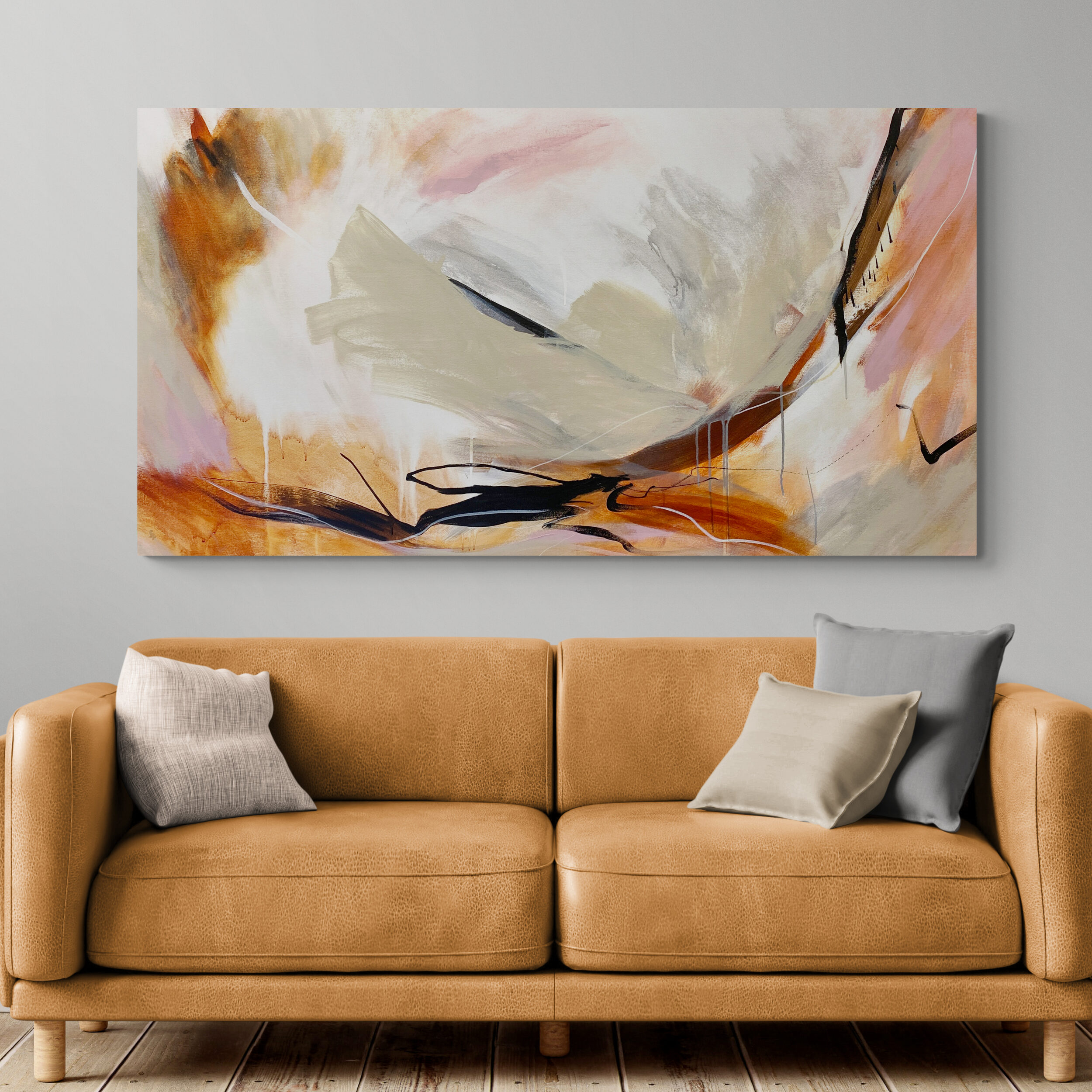 It’s intriguing mark making combined with its restful and calm palette of beautiful soft blush and subtle pinks, warm ochre and black, mixed with cool beige and white neutral tones makes this statement piece work so well in most spaces.
