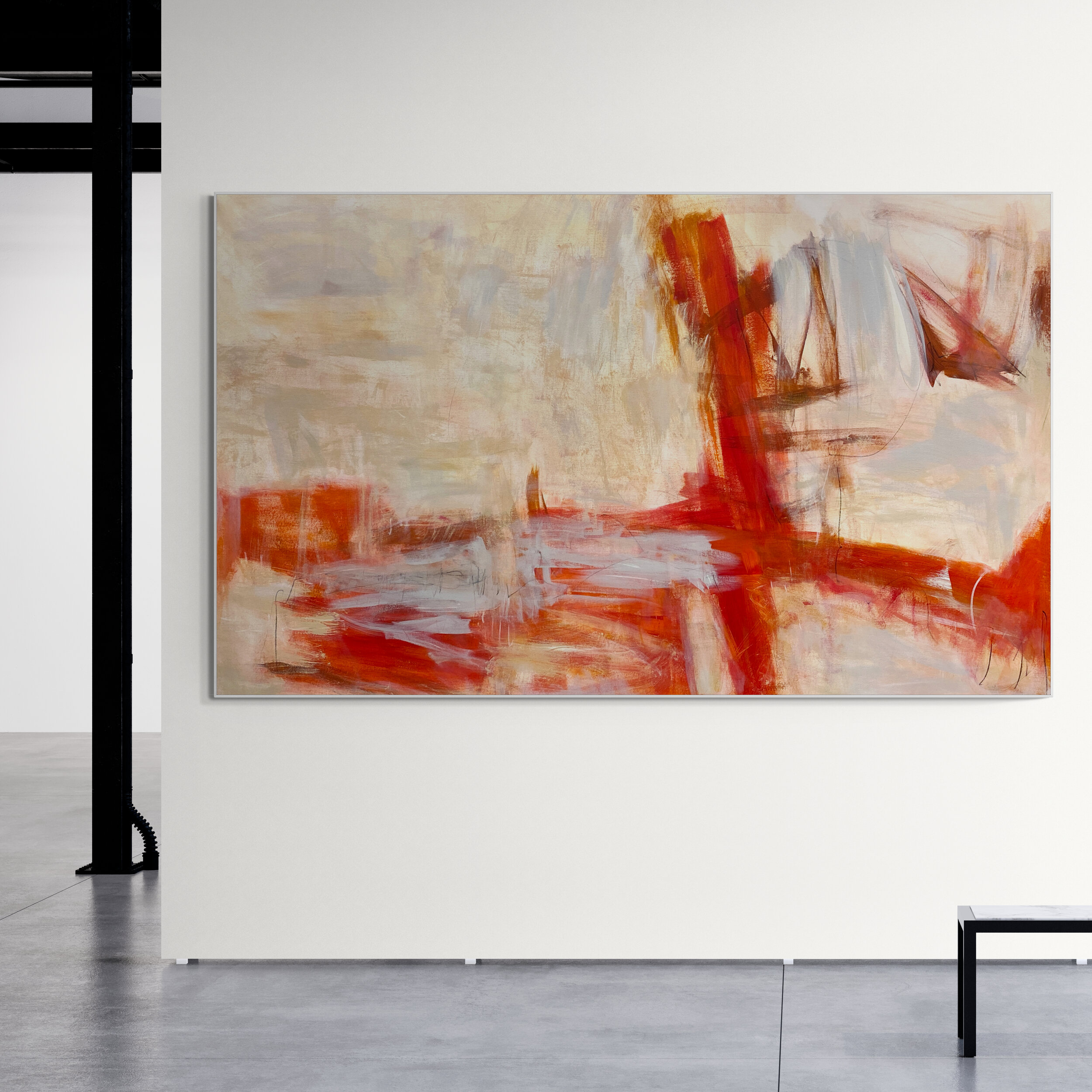 The bold mark-making compliments its striking palette of warm ochres, orange, reds and hints of magenta, mixed with thin line work in black, cool grey, beige and white neutral tones.