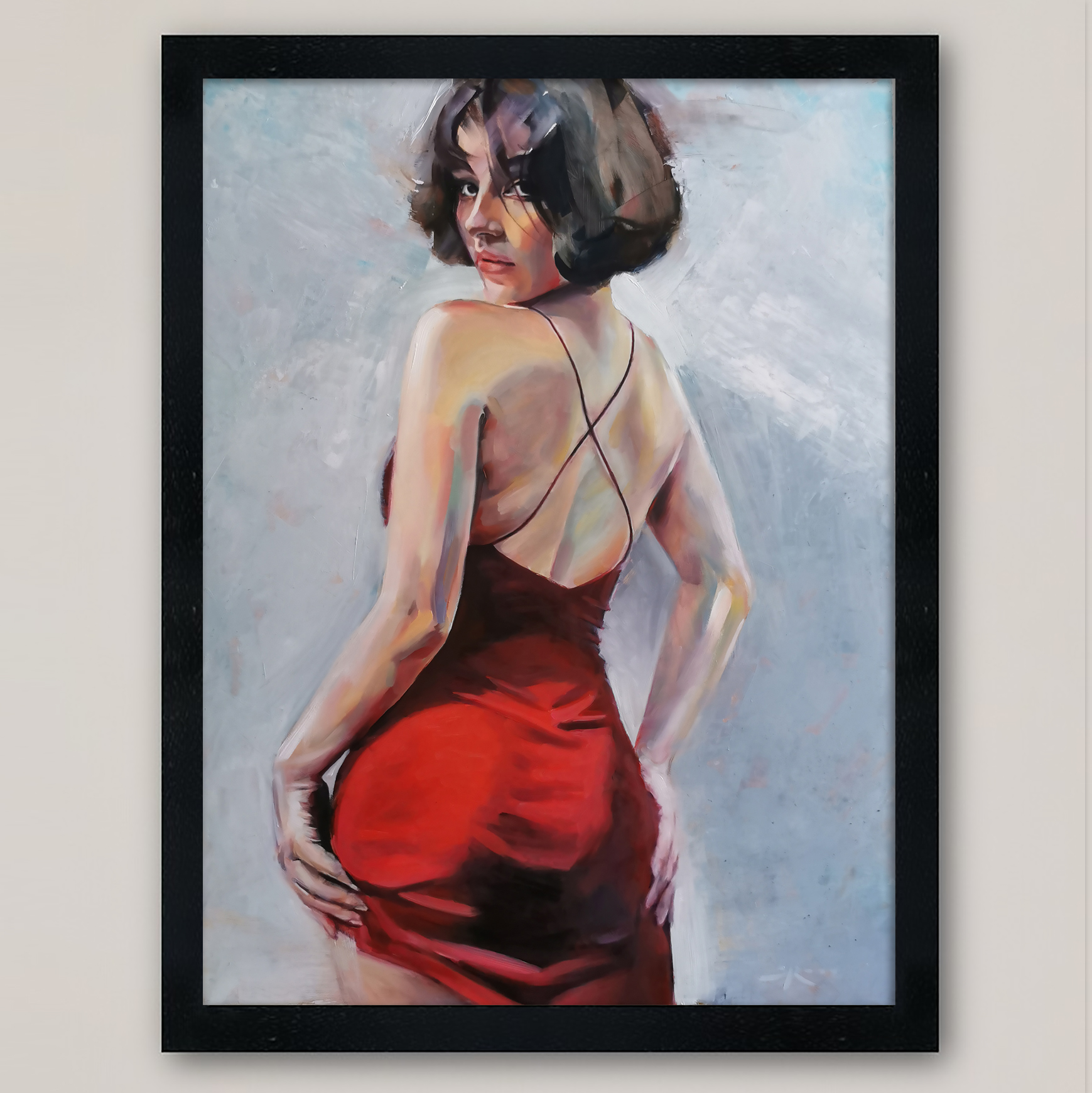 ‘En rouge’ by artist Stuart Ross is an original Oil Painting on Aluminium composite panel. This piece reveals a mixture of painting styles with light background washes, bold and colourful brushstrokes and thick impasto textures. All that reveals stunning female figure wearing a red dress, modelling a flirtatious pose. Frame not included.