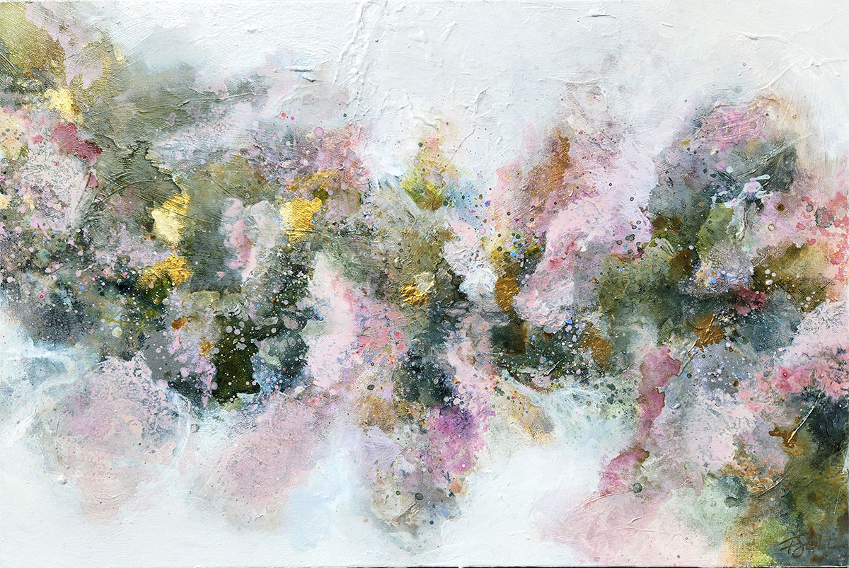 Like stepping into a lush forest full of green, pink and gold dancing across the canvas, the gold leaf shining and reflecting in different lights throughout the day.