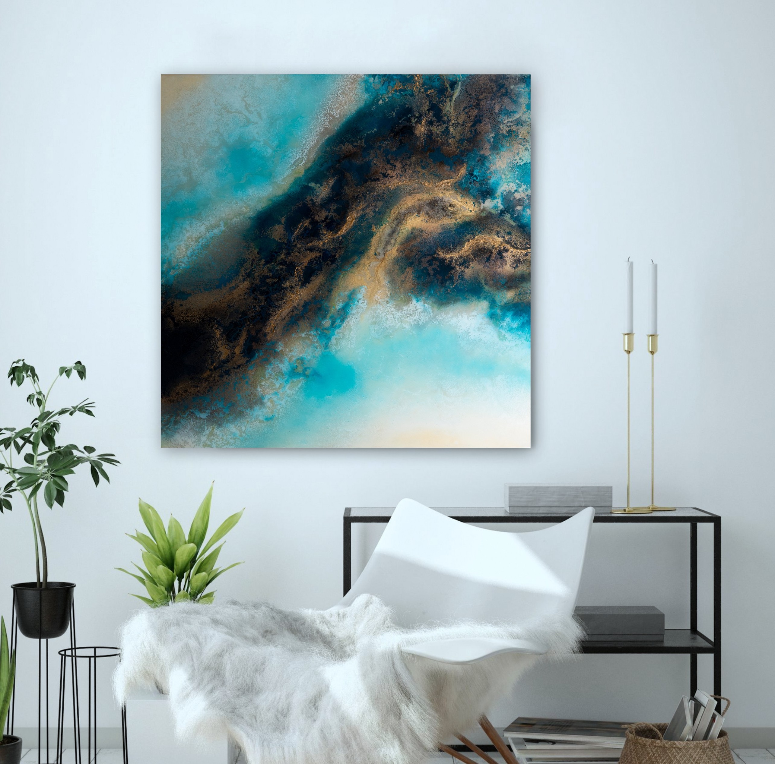 A mixed media fluid painting on a wooden panel, with a clear resin coat.