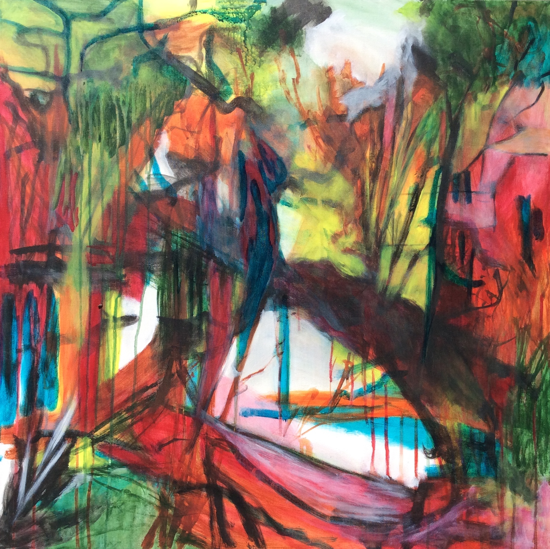 This abstract landscape painting contains many transparent colours.