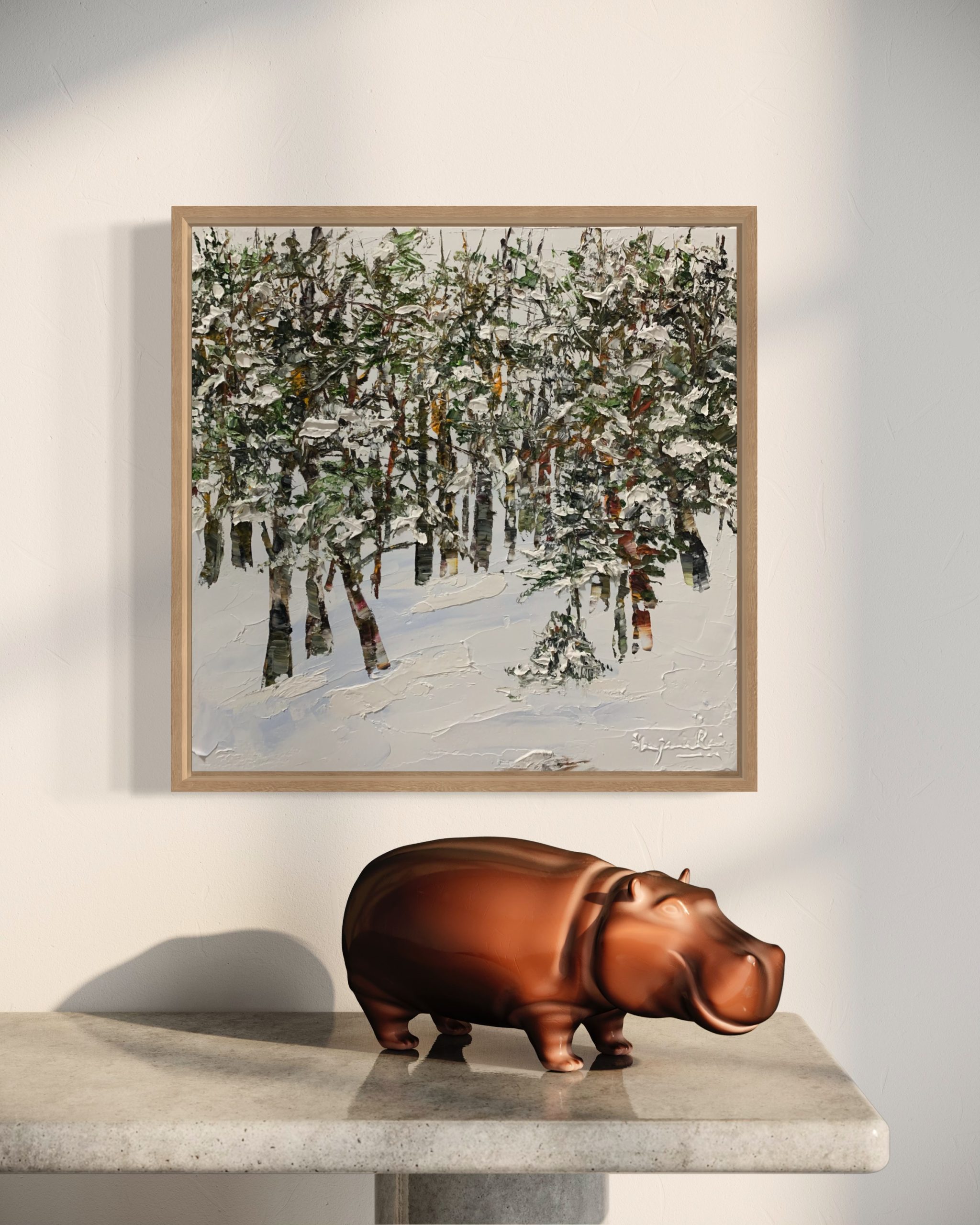 Artist Statement: In “Enchanting Winter Whispers,” I sought to capture the serene beauty and mystical ambiance of a snow-covered landscape. Through the use of heavy textures, the impasto technique, and a palette knife, I aimed to create an immersive experience, inviting viewers to explore the captivating world within the painting.