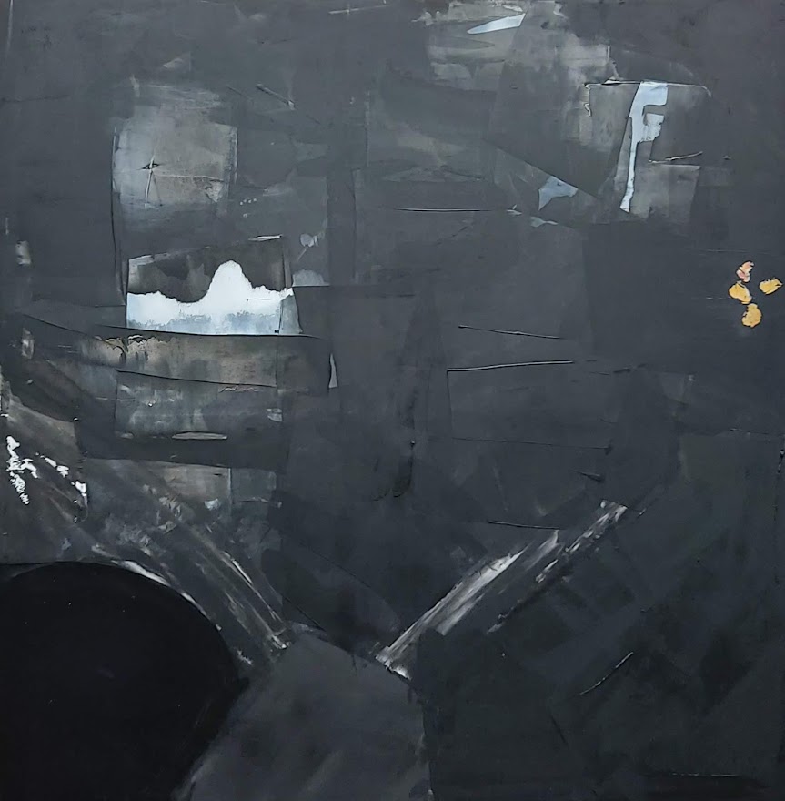 Encounter of four is an enigmatic abstract painting that portrays an intriguing encounter of four mysterious entities. The central focus of the painting is the convergence of these entities, represented through bold black lines and shapes that intersect and weave together in complex patterns of movement and energy. The dominant colour of the painting is black, a symbol of darkness and mystery that highlights the enigmatic nature of the encounter. Touches of white are dispersed throughout the painting, suggesting the presence of light and hope amidst the shadows.