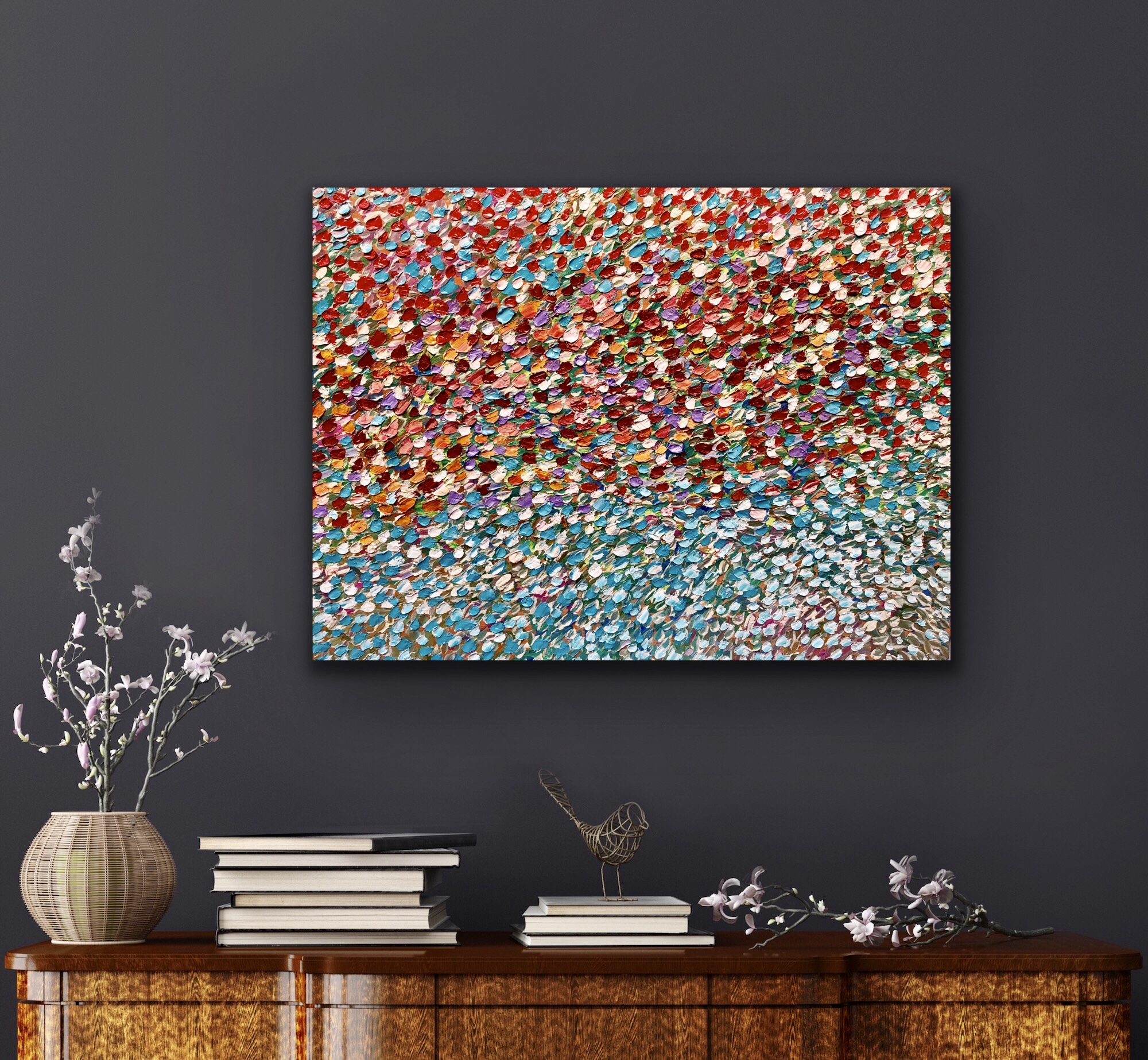 My painting endless blessings captures a beautiful bed of Petals in the landscape , creating a magical carpet full of magical blessings . Beautiful cool and warm colours of the petals dancing on to the landscape .This painting is painted with a pallet knife with thick oil paints on canvas. The painting is very textured and thickly painted. The painting is signed and dated 2019 at the back and comes with a certificate of Authenticity.
