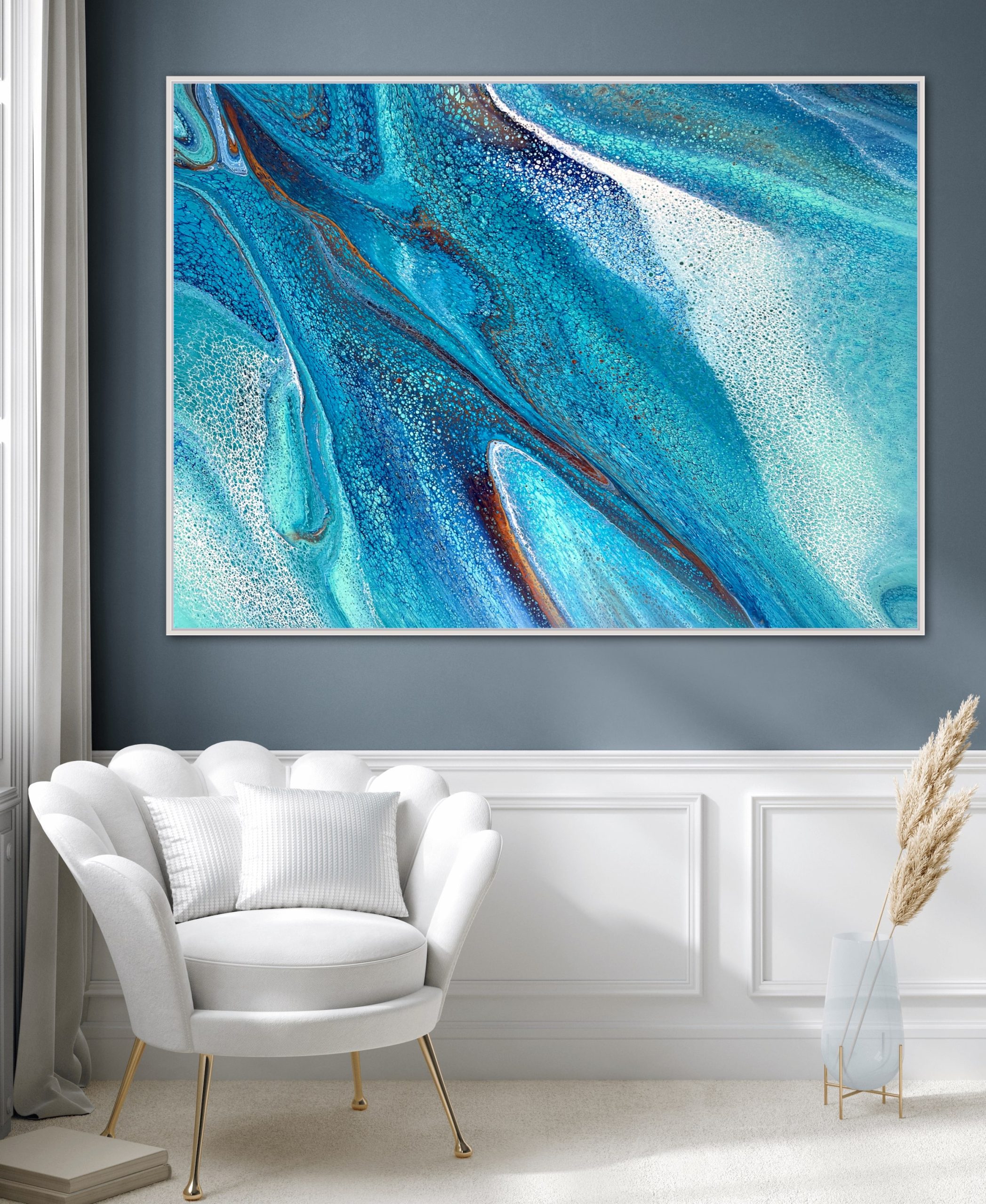 Endless Ocean was created using various techniques combined to allow increased flow, interaction and separation of colours to create interesting patterns where pops of colour can be seen emerging from underneath. This added dimension adds lace and cells to the artwork creating an interesting and one of a kind painting that can never be replicated. The metallic paint used reflects the shifting light beautifully really bringing the painting to life.