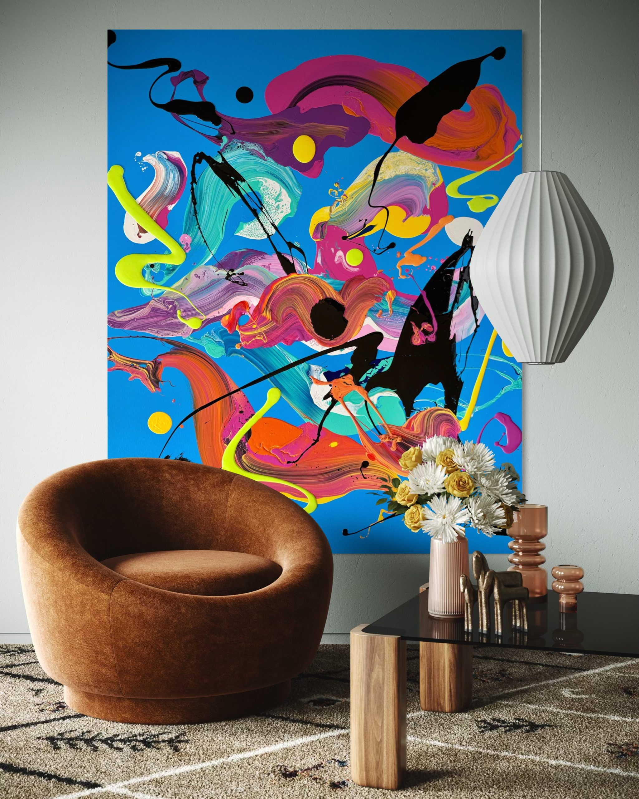 Energetic Flow by Jonathan Redmayne explores a vibrant display of swirling Colours on a blue canvas, exuding energy and movement.