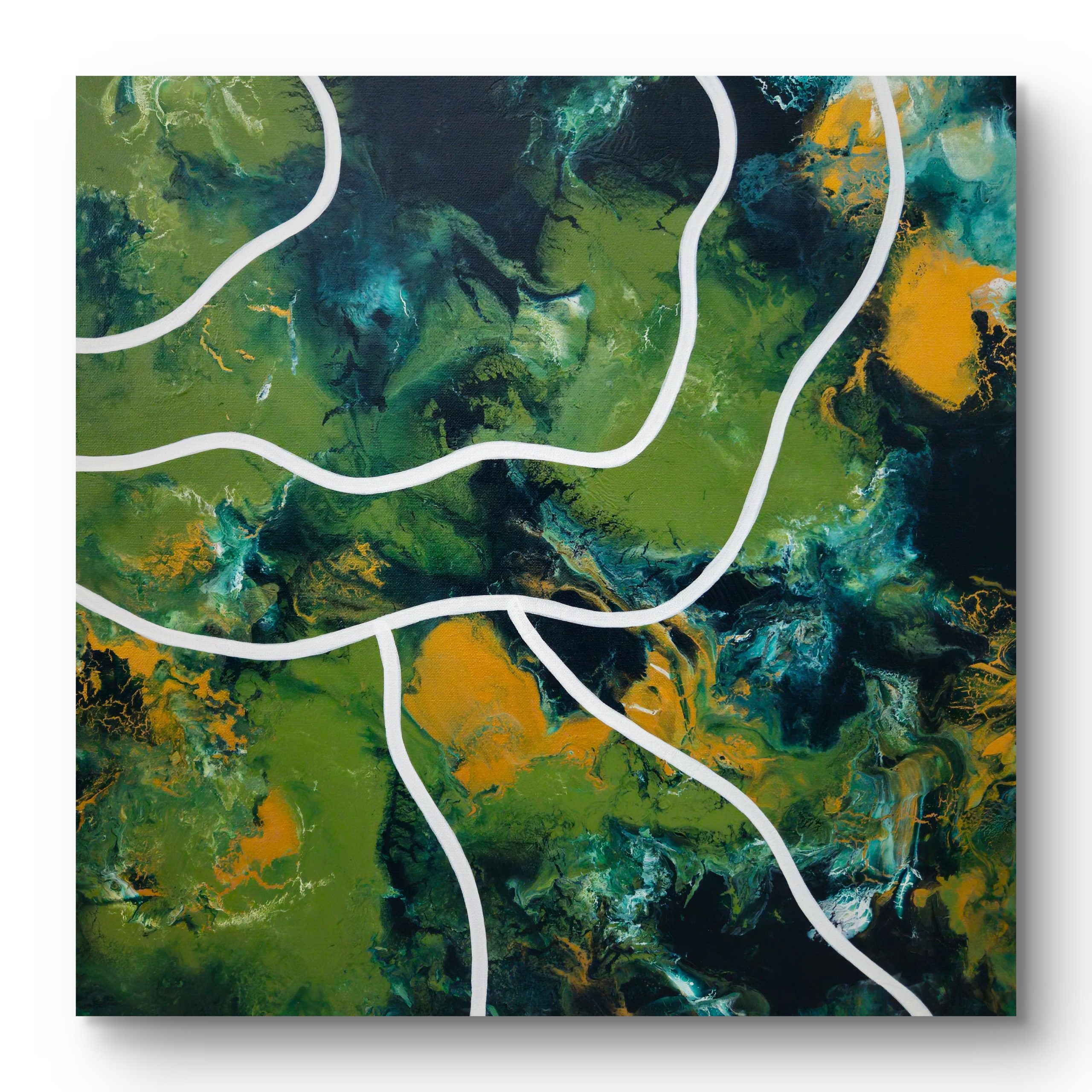 This abstract acrylic painting captures the organic energy of nature through flowing green tones, vibrant golds, and deep textures. White lines wind across the surface like rivers or root systems, suggesting hidden connections and natural rhythms.