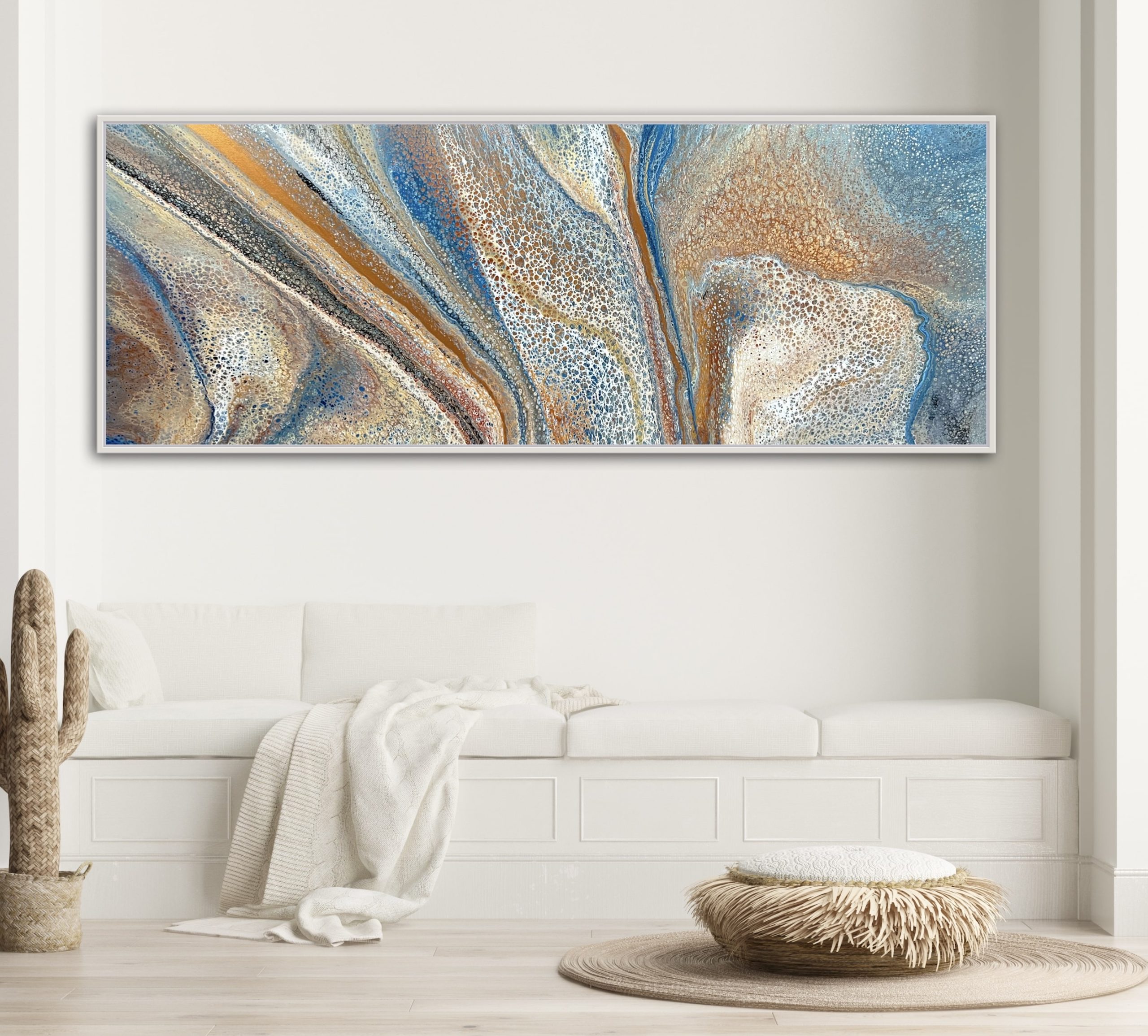 Engaging Earth was created using various techniques combined to allow increased flow, interaction and separation of colours to create interesting patterns where pops of colour can be seen emerging from underneath. This added dimension adds lace and cells to the artwork creating an interesting and one of a kind painting that can never be replicated. A gorgeous variety acrylic pigments were used including metallic yellow & rose gold, bronze, copper, silver, cream, brown, grey, blues, black and white.