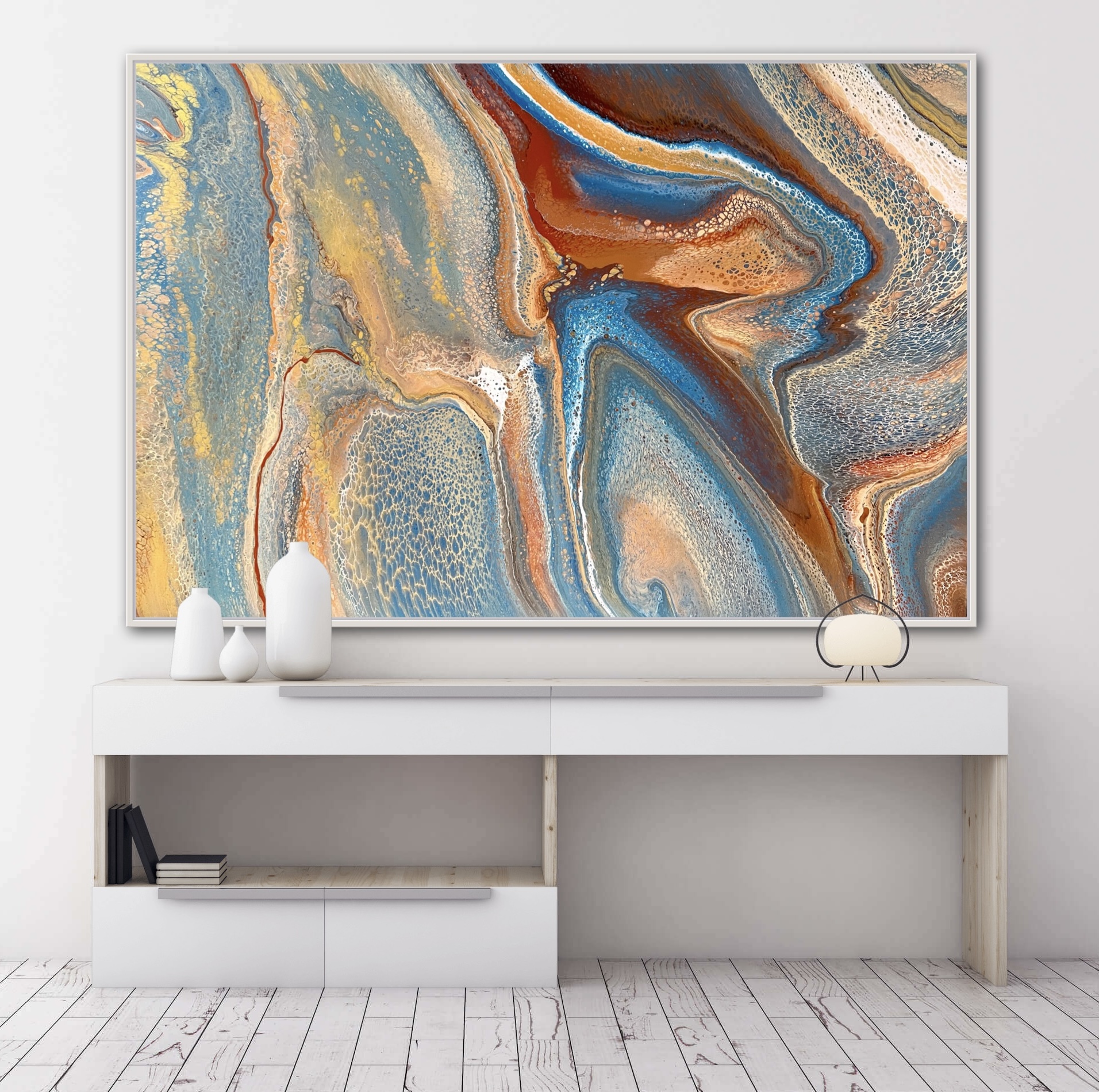 Engaging Nature was created using various techniques combined to allow increased flow, interaction and separation of colours to create interesting patterns where pops of colour can be seen emerging from underneath. This added dimension adds lace and cells to the artwork creating an interesting and one of a kind painting that can never be replicated. A gorgeous variety acrylic pigments were used including metallic yellow and warm gold, cream, yellow, blues, bronze, copper, silver, grey, black, rose gold and white.