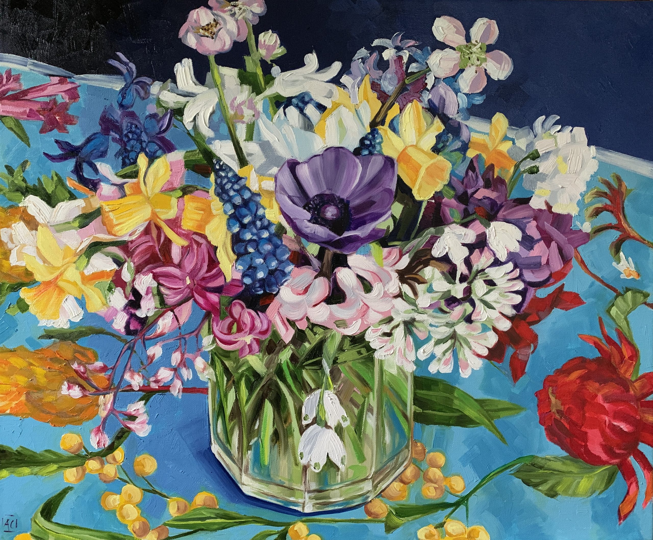 In this painting a Vintage Tea towel depicting Australiana on linen sits underneath a thick glass holding a big handful of European flowers from the garden – daffodils, cherry blossom, hyacinth, bluebells and more.