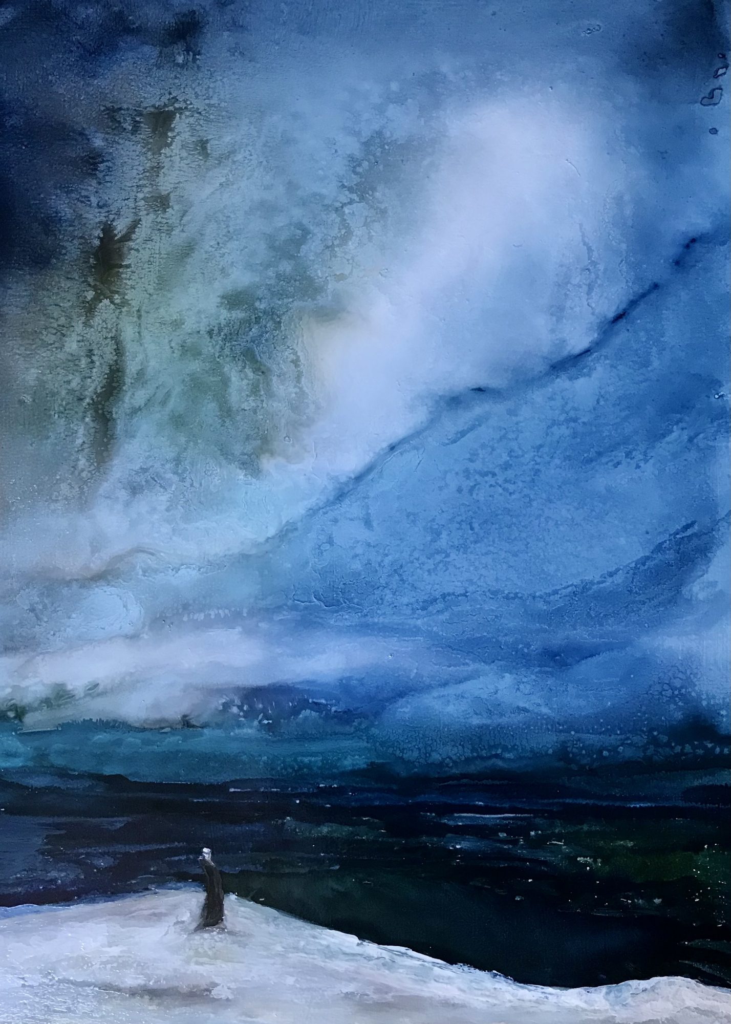 Engulfed By An Endless Solitude by Meg Lewer – This painting is inspired by the haunting work ” Monk By The Sea” by Caspar David Friedrich 1810.