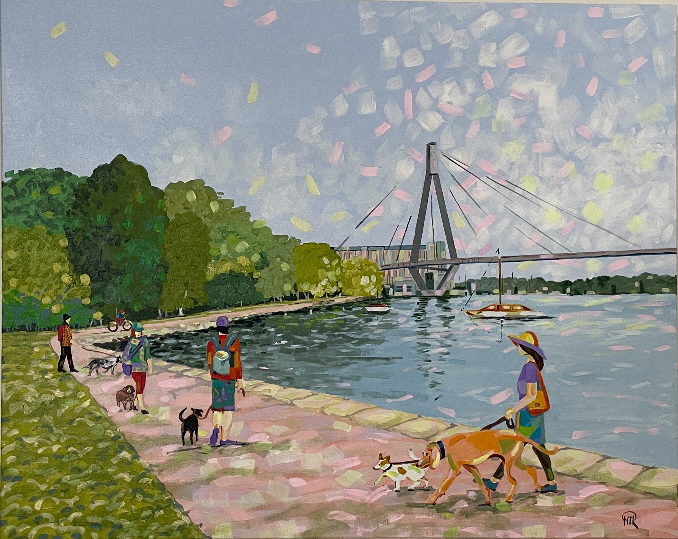 Walking along the Glebe foreshores in Sydney is one of life’s greatest pleasures. Add your mate and the day is perfect. Bright colours and bold brushstrokes emphasise the joy and pleasure always present.