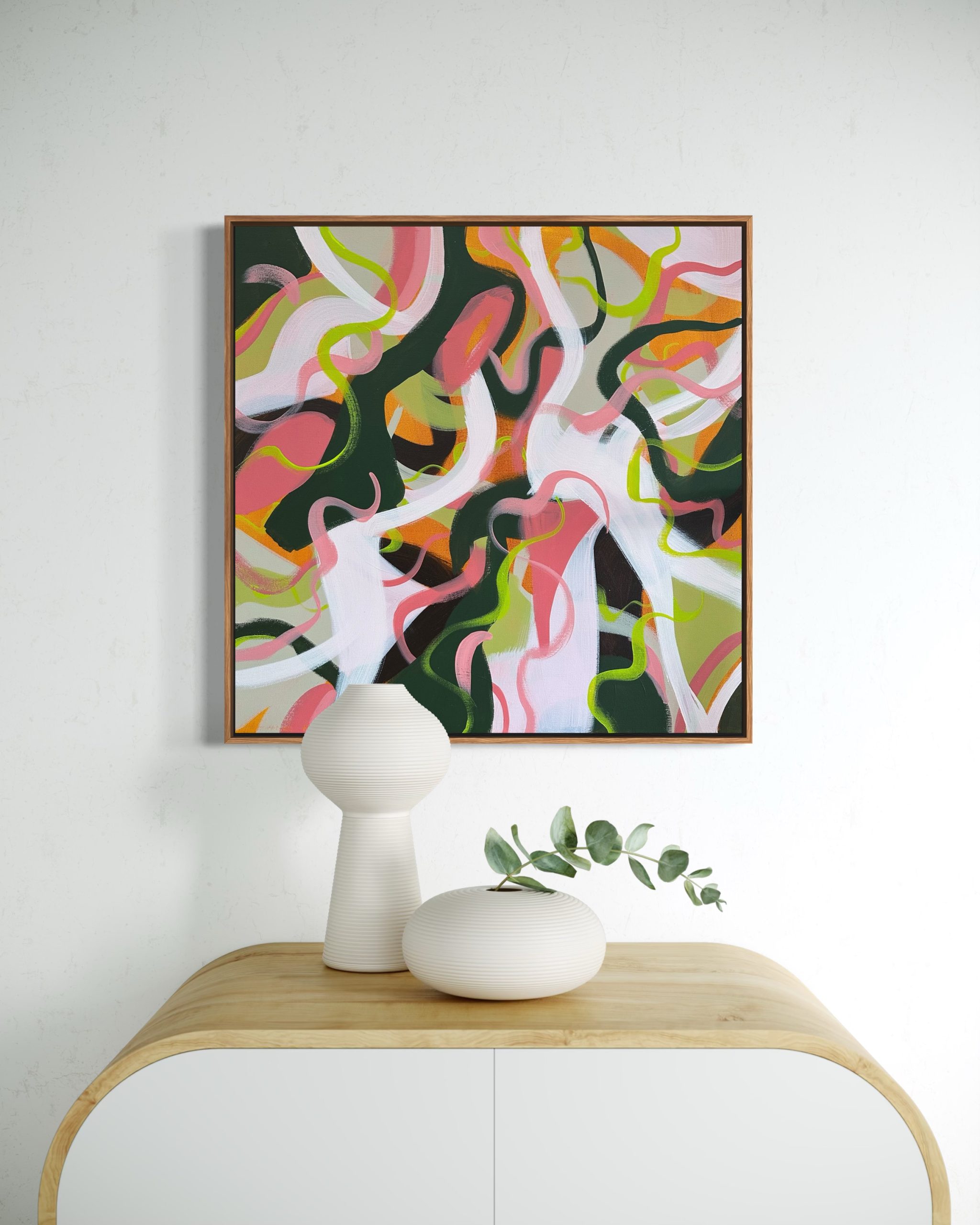 From the series – Organically playful, inspired by the colours of Spring and Summer, luscious pinks, joyful oranges and soothing greens intertwined in organic lines. Bring the feeling of play and fun into your home. Think of the roots and vines growing all over the Australian rainforest, chaotic and beautiful all at once.