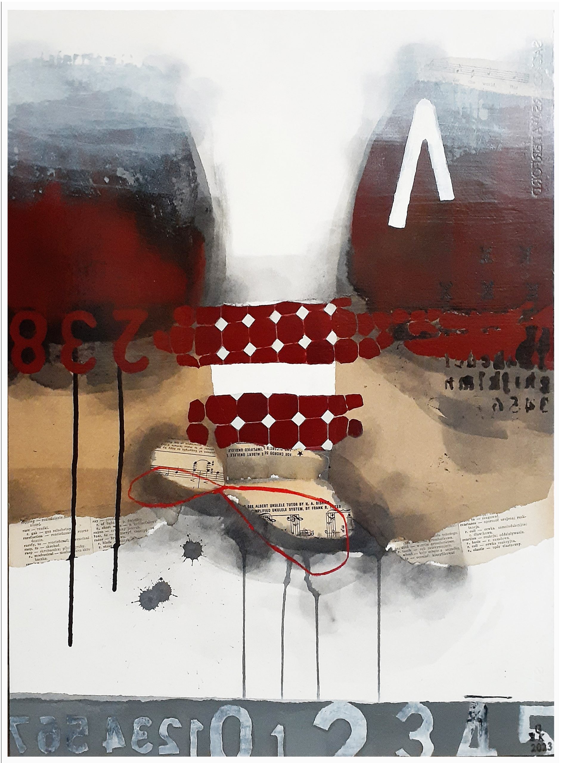 “Equals” is an original mixed media artwork by Melbourne abstract artist G Kustom Kuhl who uses vintage paper products to created an abstract composition. These materials include vintage